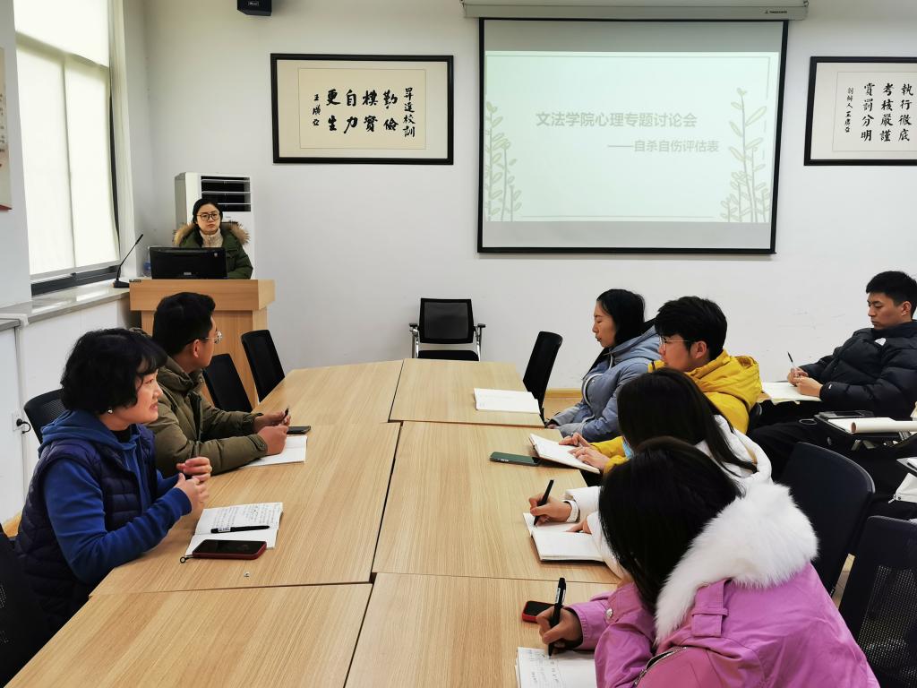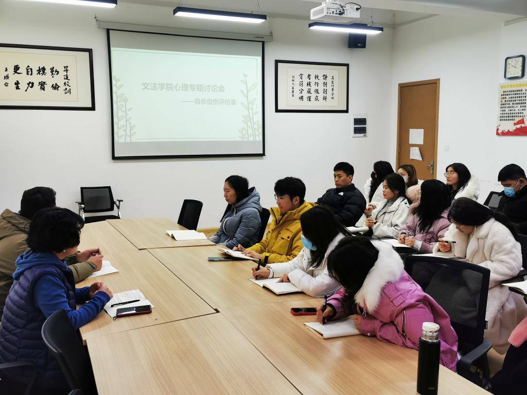为进一步提升辅导员心理健康教育能力,促进员工健康发展,12月18日上午,365VIP英国上市官网在教学一号楼314会议室开展关于自杀自伤评估的心理专题讨论会,以提高辅导员对自杀自伤现象的认识,提升心理危机干预和预防能力。365VIP英国上市官网行政秘书郑玲玲和全体辅导员参加此次讨论会,心理中心王海飞老师莅临指导。