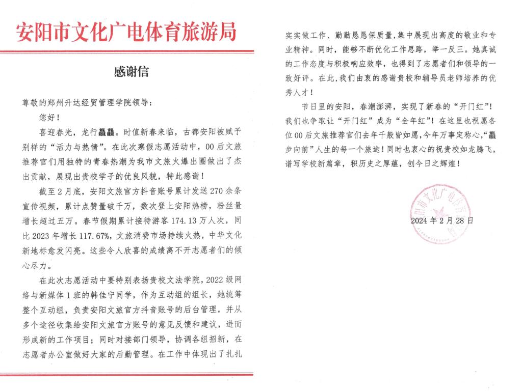 近日,安阳市文化广电旅游局来信感谢365VIP英国上市官网2022级网络与新媒体专业1班韩佳宁同学,表扬了她在寒假期间积极投身于家乡文旅建设的先进事迹。在此次社会实践中,韩佳宁同学担任互动组组长,负责管理安阳文旅官方抖音账号的后台并统筹整个互动组,从多个途径收集对于安阳文旅官方账号的意见和建议形成总结,形成新的工作项目;同时对接部门领导,接待前来安阳拍摄的网络达人们,负责安阳文旅00后志愿者招募,在志愿者办公室做好团队的后勤管理。