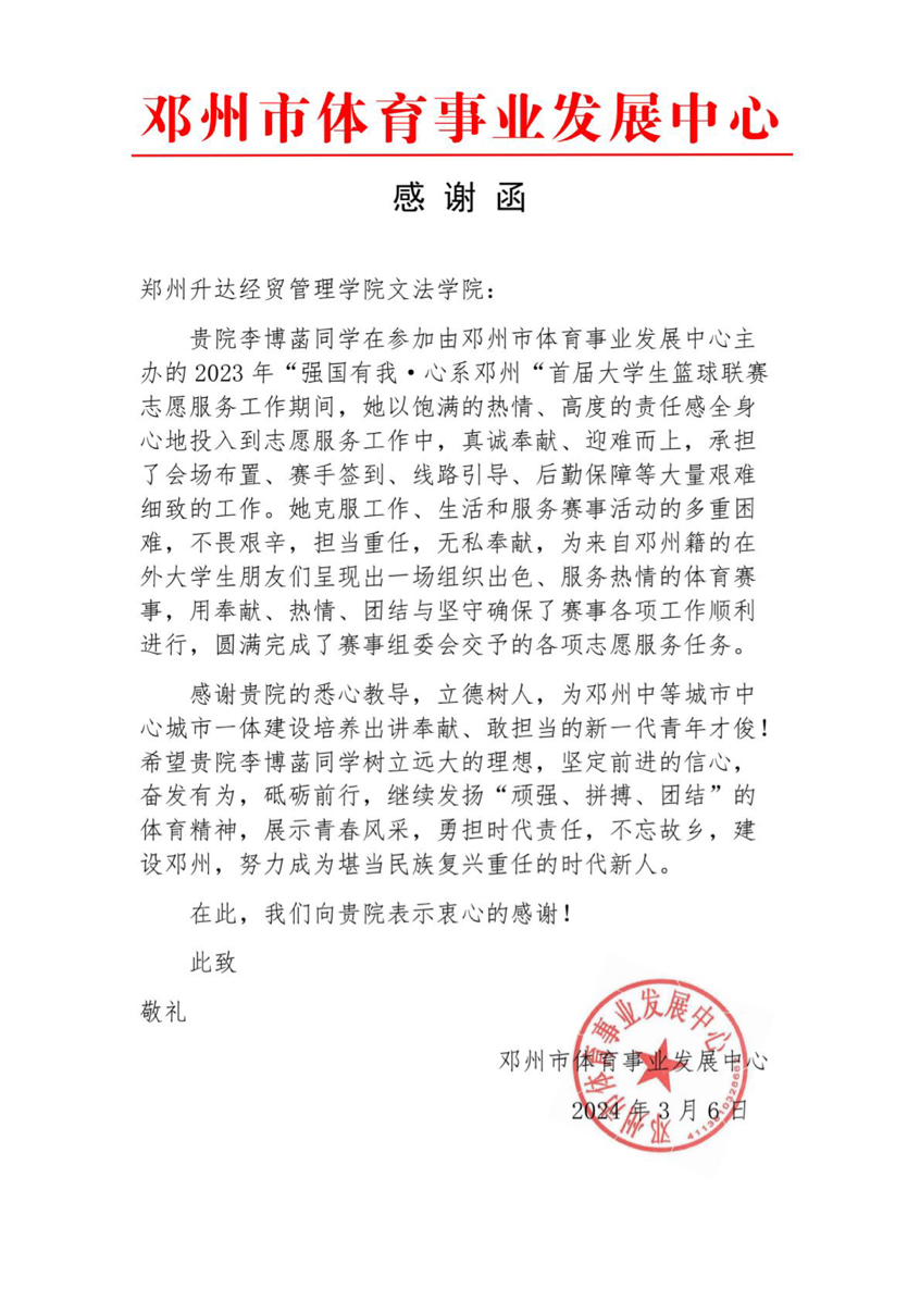 近日,邓州市体育事业发展中心来信感谢365VIP英国上市官网2021级法学专业三班李博菡同学,表扬了她在参加由邓州市体育事业发展中心主办的2023“强国有我•心系邓州”首届老员工篮球联赛期间志愿服务的优异表现。