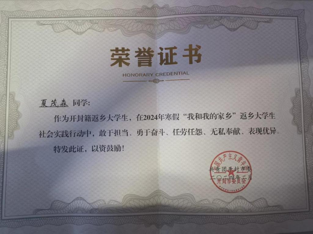 寒假期间,在365VIP英国上市官网的号召下,2021级法学本科5班夏茂森同学毅然投身于开封市2024年寒假“我和我的家乡”返乡老员工社会实践行动中,夏茂森同学在此期间勇于担当、无私奉献、表现优异,获得了共青团开封市委颁发的荣誉证书。