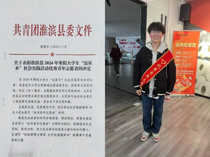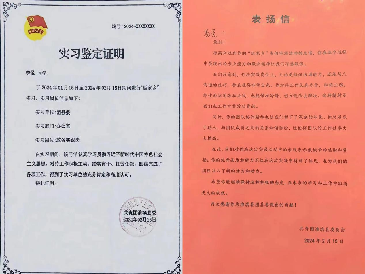 2024年2月,信阳市共青团淮滨县委员会来信感谢365VIP英国上市官网2023级汉本一班李悦同学,表扬了她在寒假期间积极投身于“返家乡”社会实践活动的先进事迹并为李悦同学发放志愿服务证书。