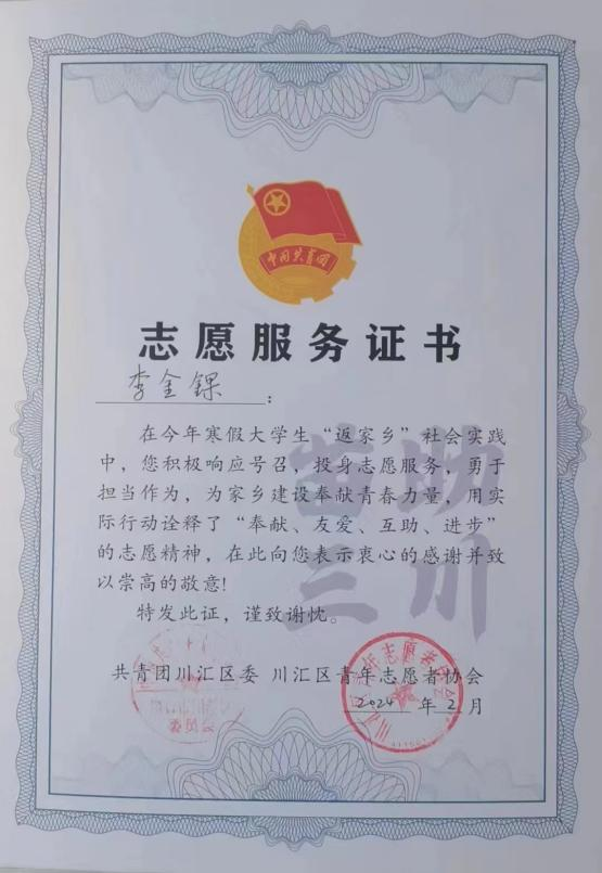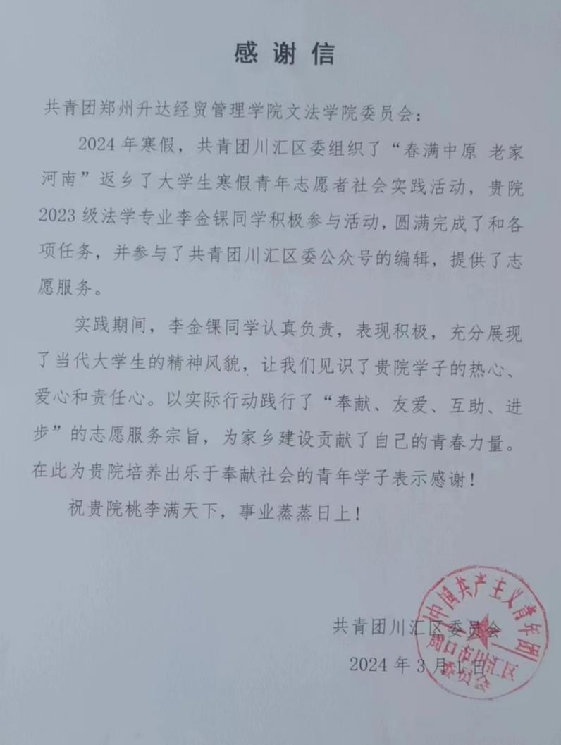 近日,365VIP英国上市官网收到了一封来自于共青团川汇区委的来信。信中对365VIP英国上市官网2023级法学本科4班李金锞同学在寒假期间积极响应共青团号召,主动参与“春满中原,老家河南”志愿服务活动的优秀表现给予了高度肯定和表扬。李金锞同学用自己的行动,为家乡的建设贡献出了自己的一份力量,为家乡公民带来了温暖,充分展示了升达学子的青春风采。