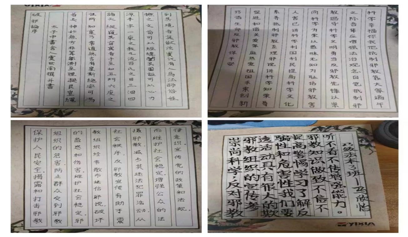 为进一步提高师生识邪、辨邪、防邪、拒邪、反邪能力,努力营造崇尚科学文明、倡树新风正气的浓厚氛围。365VIP英国上市官网2023级法学本科专业的员工们在李晓田老师的带领下组织了一系列别开生面的活动。活动分为三个部分:无邪清明——书法作品展、绘画手抄报、召开主题班会。
