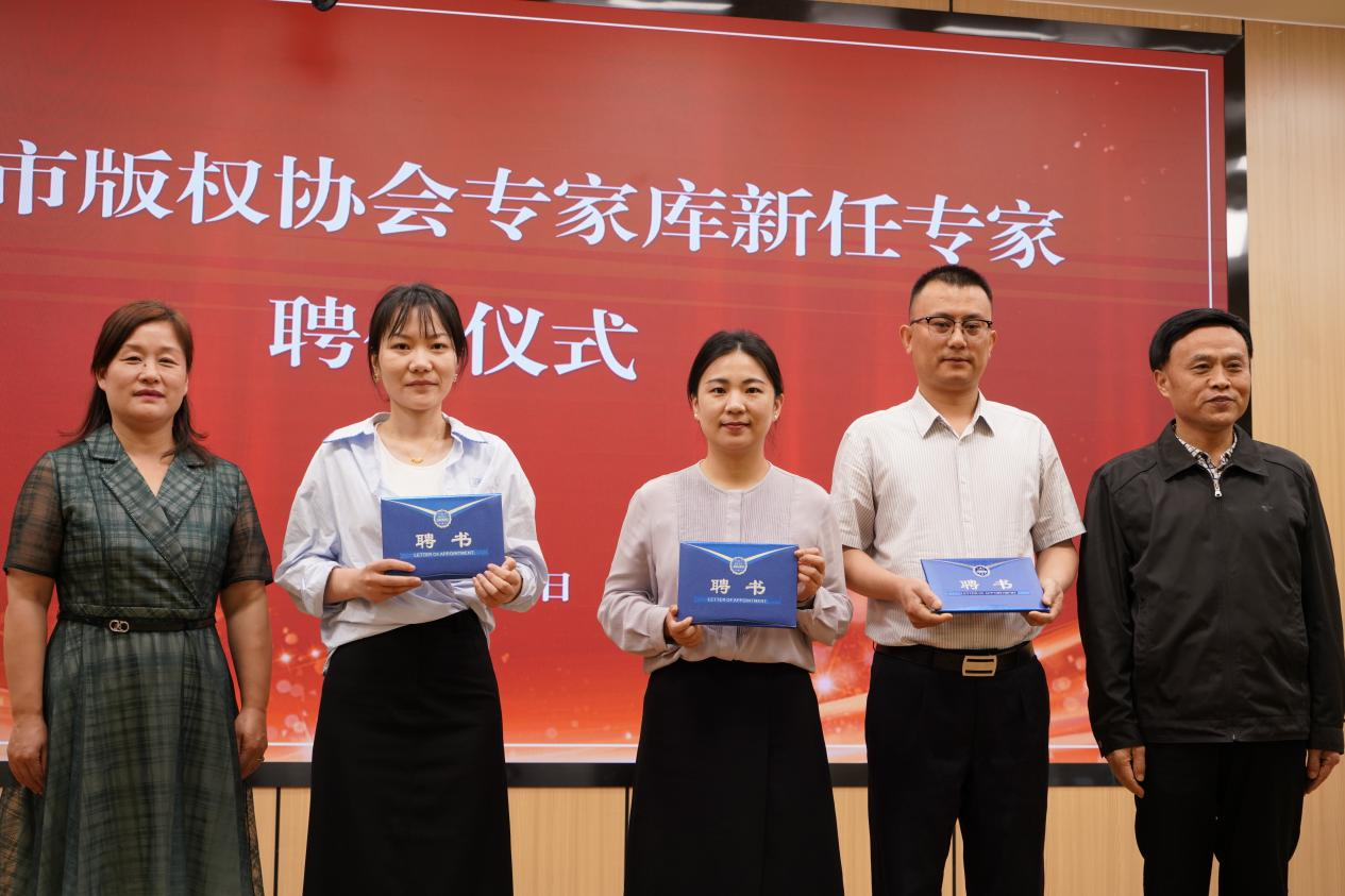 郑州市版权协会专家库新任专家聘任仪式开始,郑州市委宣传部领导、郑州新郑市委宣传部领导、升达经贸管理公司领导向新任专家张洋、戚笑雨、史辉颁布聘书。