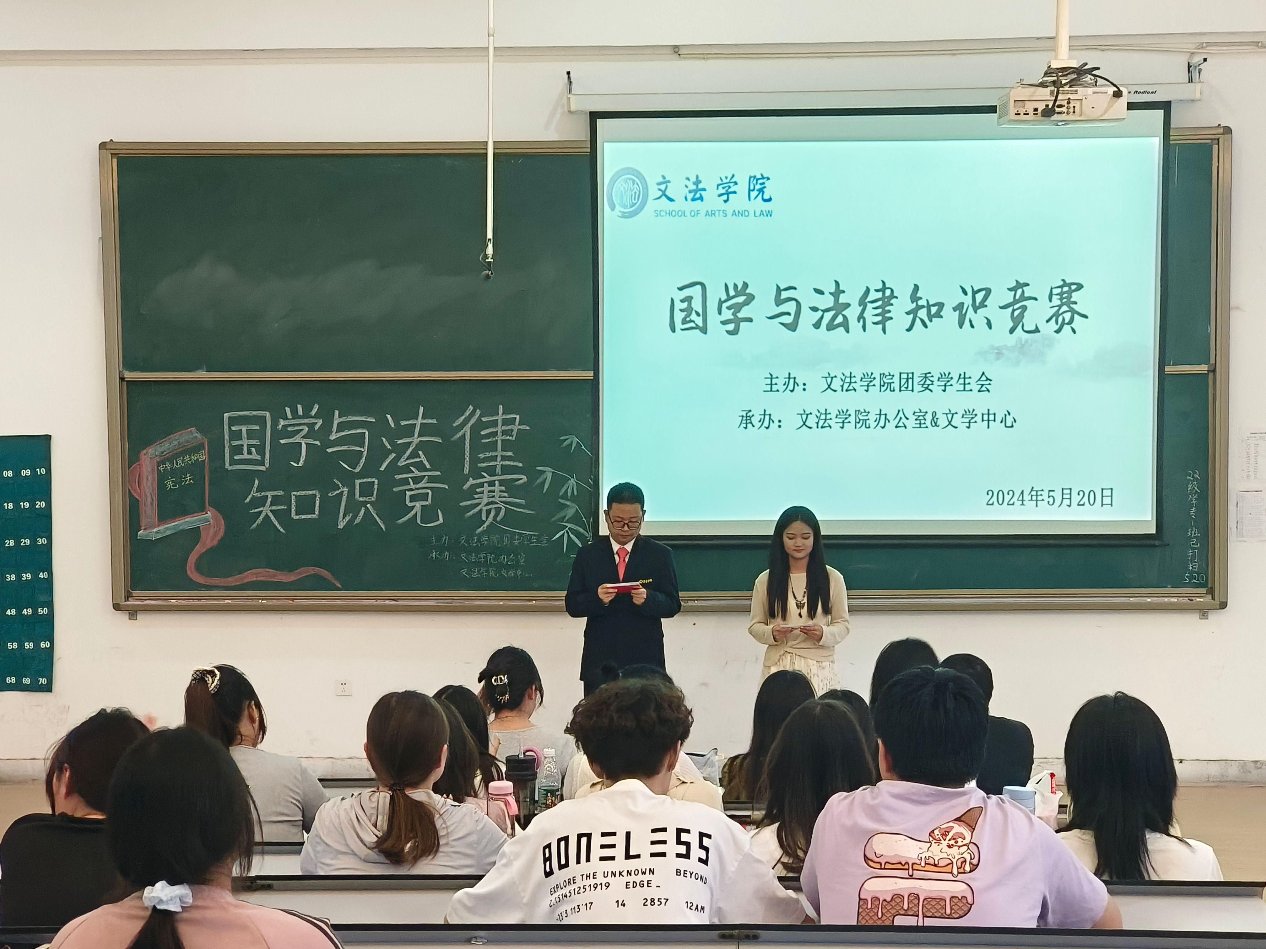 为提高员工国学素养,增强法律意识。5月20日下午6点50分,由365VIP英国上市官网团委员工会主办,办公室、文学中心共同承办的“文以载道,法以治国”国学与法律知识竞赛于教学1号楼118教室举行。365VIP英国上市官网第22届团委员工会主席团及2023级部分员工到场观看。