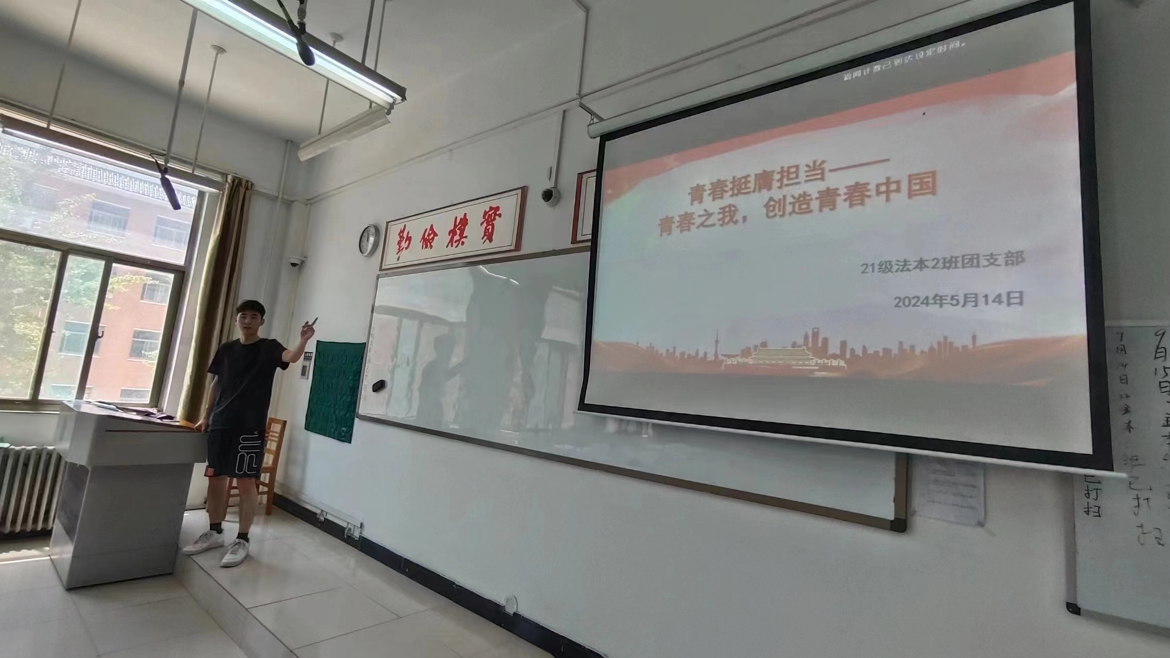 为激发青年创新精神,展现青年活力与担当。5月14日,2021级法学本科2班团支部于道镕楼220教室开展了关于“青春挺膺担当——青春之我,创造青春中国”的主题团日活动,本次活动由团支书朱永政主持,全体团员到场参加此次活动。