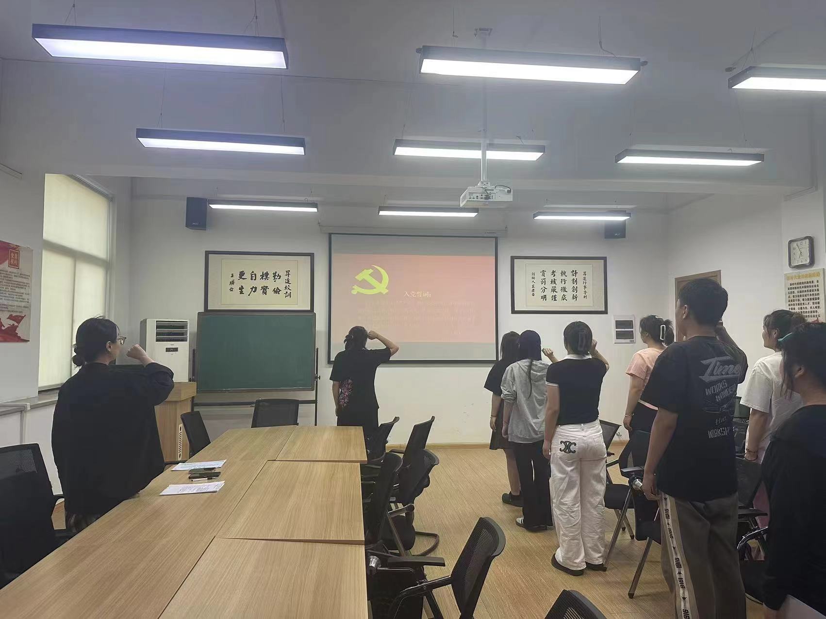 支部书记王霄介绍了本次会议议程。预备党员邵宇同志汇报了自己在预备期间的工作和学习情况,客观评价自身,表示要坚持理论与实践相结合,加强党性修养,努力做好本职工作,尽职尽责服务同学。随后,培养联系人结合预备党员的实际情况,进行了说明。经与会党员无记名投票表决,一致同意邵宇同志的转正申请,全体参会人员在组织委员邓雨欣的带领下进行庄严宣誓。