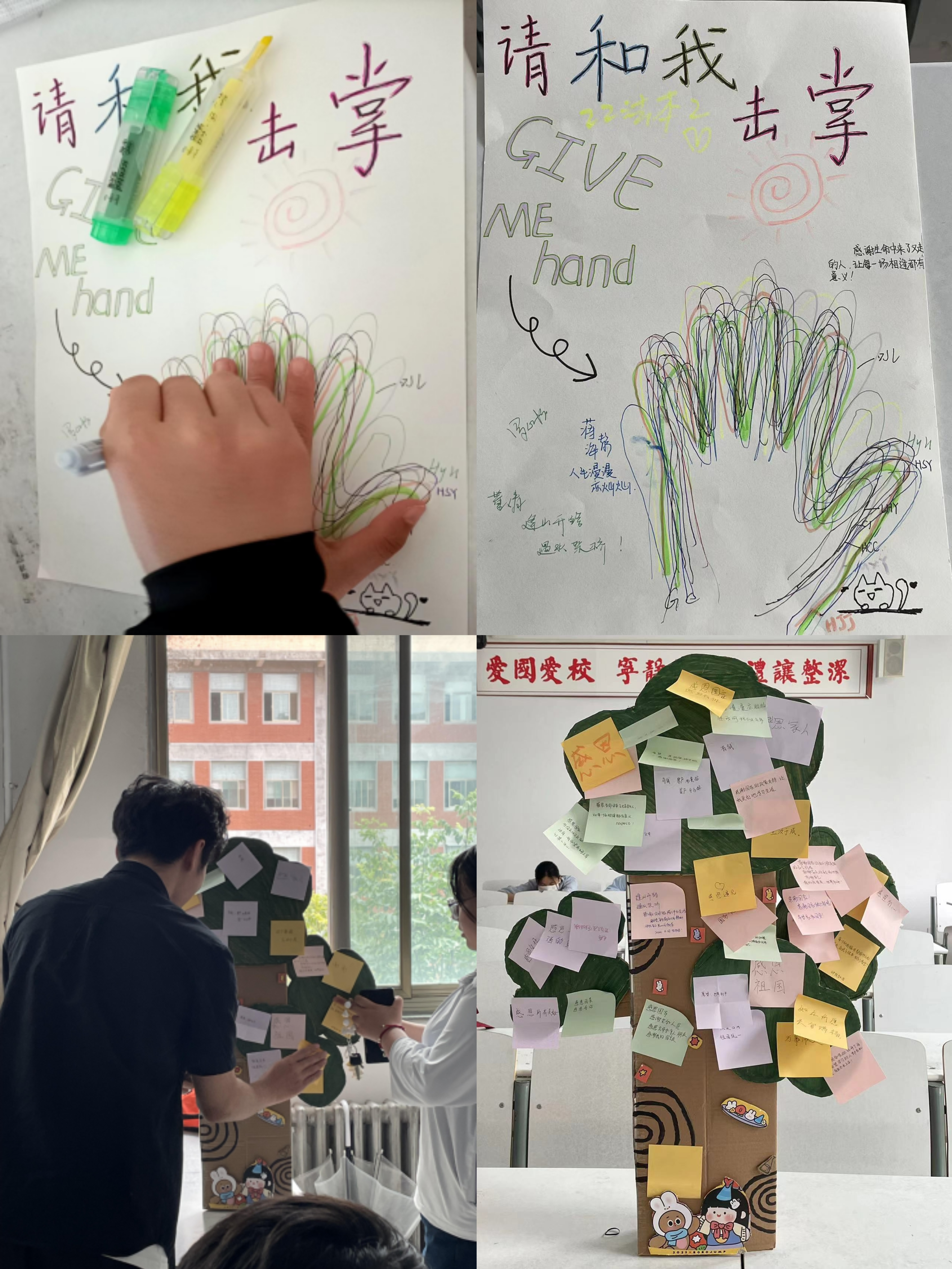 紧接着,同学们在班委的组织下开展了“击掌为盟,感恩为誓”和“爱心许愿树”活动。同学们在纸上绘出自己的手掌,表达他们对国家资助政策的深深谢意,并纷纷举起“感恩之手”,相互击掌,立下誓言,要用勤奋学习、积极进取的实际行动回馈国家的关怀。此外,同学们制作了一棵满载希望的许愿树,写下对未来的期许和对国家资助的感恩之情,将心愿卡挂上树枝。这棵许愿树不仅是大家心灵的寄托,更是见证他们成长的里程碑。每一张卡片,都是一个感恩的故事,每一颗心愿,都是对国家资助的深情致谢。