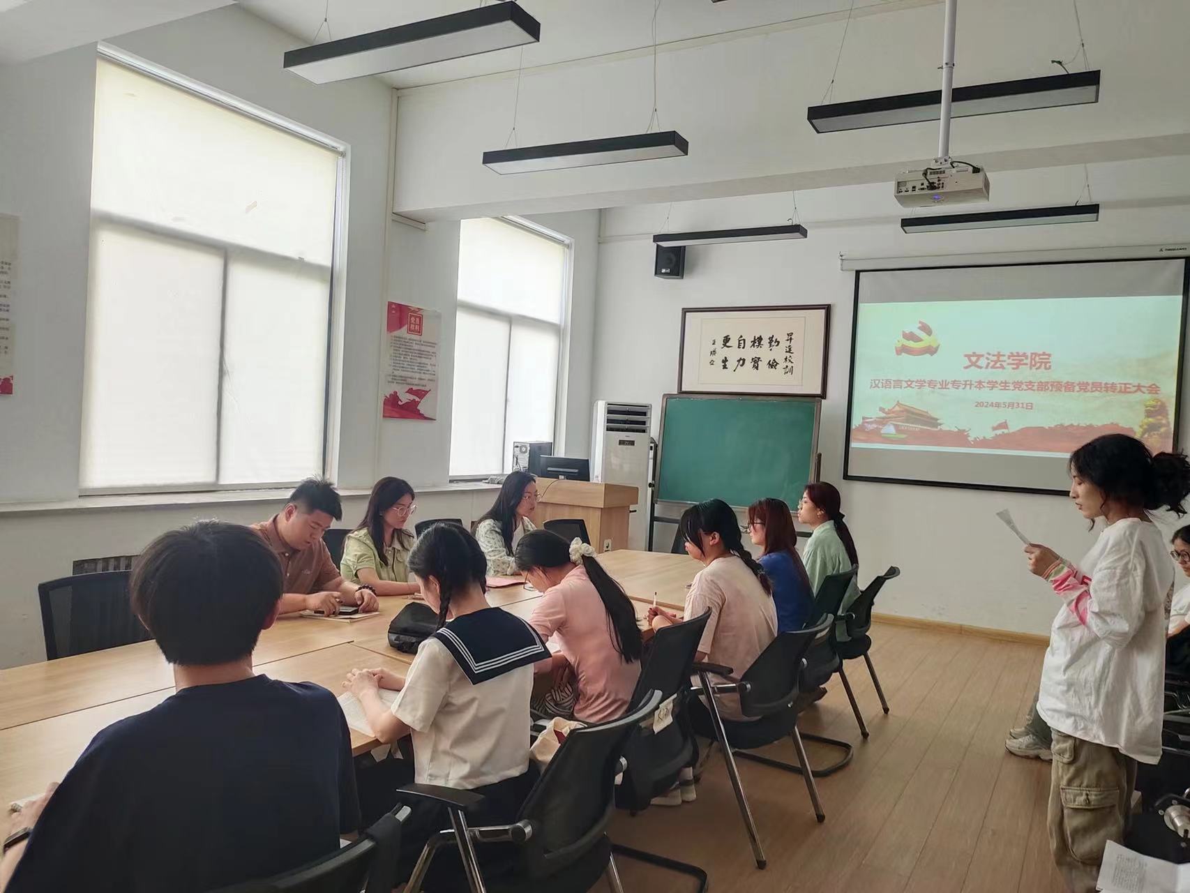 2024年5月31日中午,汉语言文学专升本专业员工党支部在教学1号楼314会议室召开预备党员转正大会。会议由支部书记张丽凯主持,支部全体党员参会。