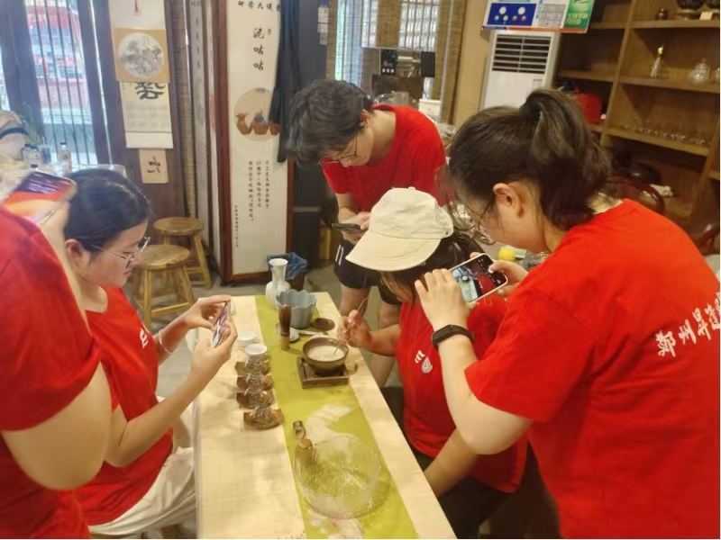 7月23日,团队来到了清明上河园。队员们用镜头捕捉着每一个精彩的瞬间,从精彩的表演到精美的建筑,从热闹的街市到宁静的墙壁。他们努力将这份独特的文化氛围和历史韵味留存下来。在专业人员的指导下,队员们进行宋代点茶文化体验,在烫盏,抹茶粉,调膏,注汤,击拂等一系列操作中,感受着宋代文人雅士的闲情逸致。队员们沉浸在这充满古韵的氛围中,用心体会着中华优秀传统文化的深厚底蕴。通过这次点茶文化体验,队员们对宋代的生活方式和审美情趣有了更深刻的理解,也为此次的文化探寻之旅增添了一抹别样的色彩。