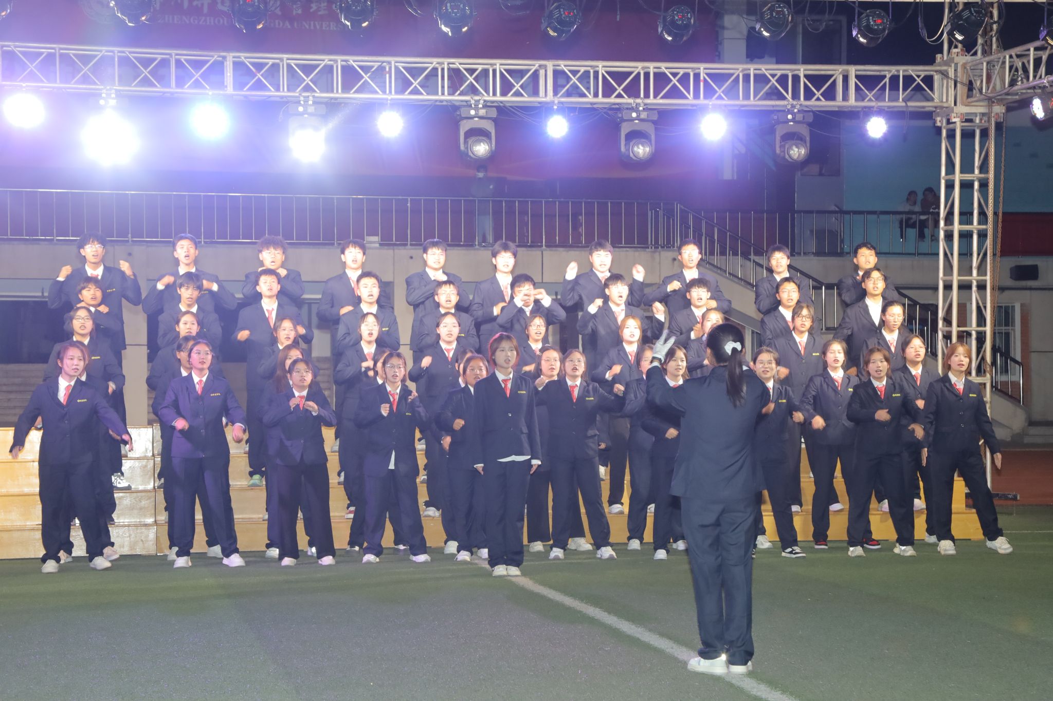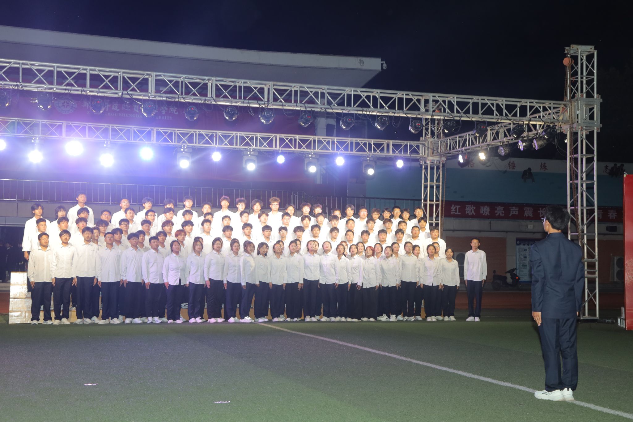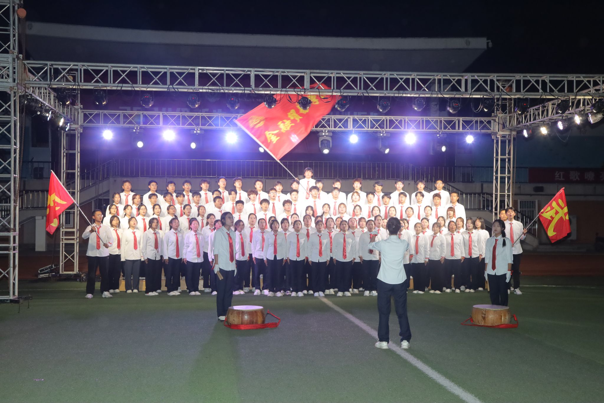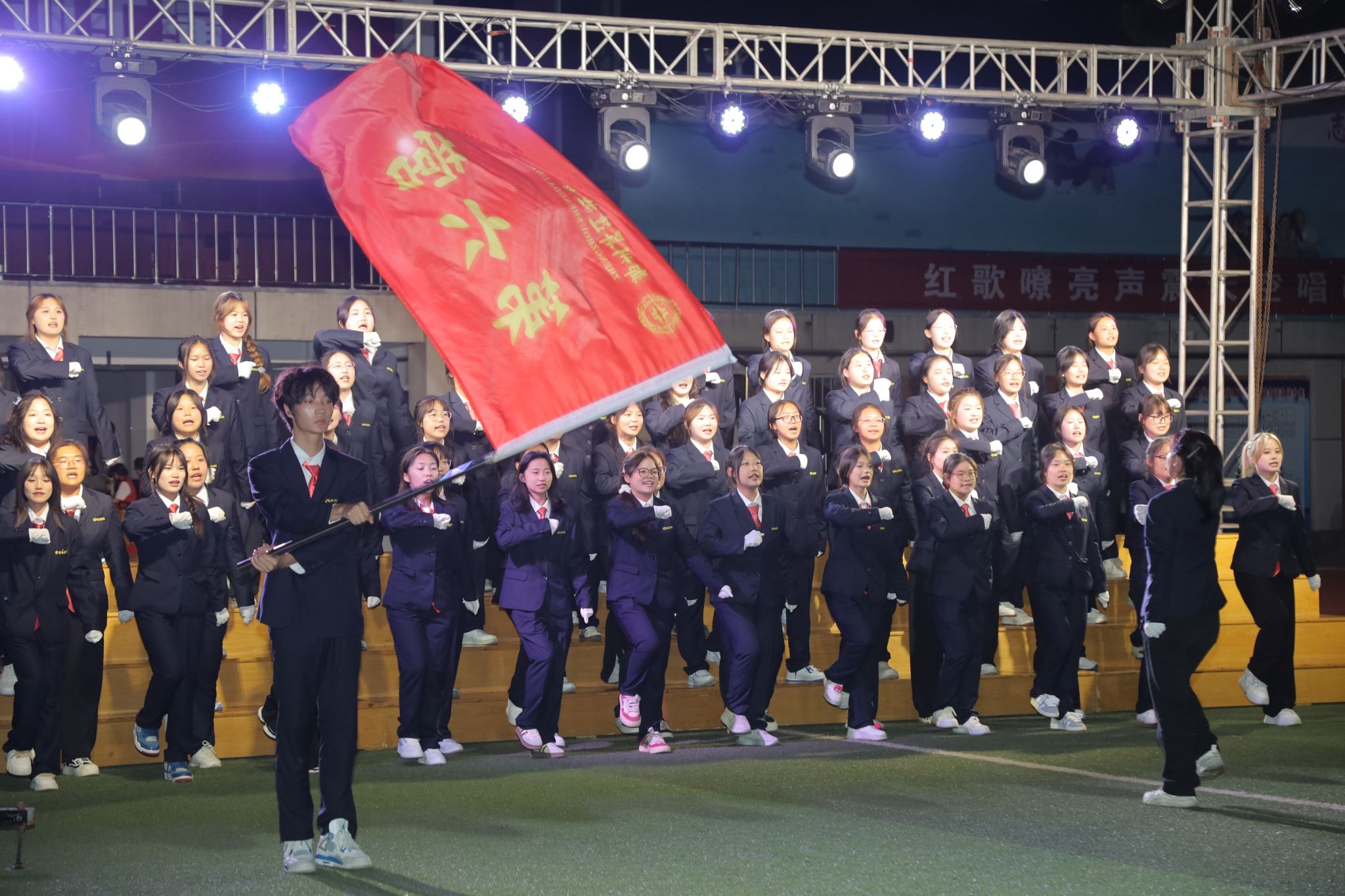 比赛开始,一首首耳熟能详、朗朗上口的红色歌曲响彻校园的夜空。经过前期的精心准备和认真练习,同学们以饱满的热情和昂扬的状态站上舞台。《歌唱祖国》《我和我的祖国》唱出了同学们炽烈的爱国热情;《没有共产党就没有新中国》歌颂了中国共产党带领人民群众披荆斩棘的百年风雨;《强军战歌》《当那一天来临》抒发了人民解放军保卫国家的决心和使命……每一首歌曲都承载着厚重的历史记忆,每一句歌词都激荡着浓郁的爱国情怀。