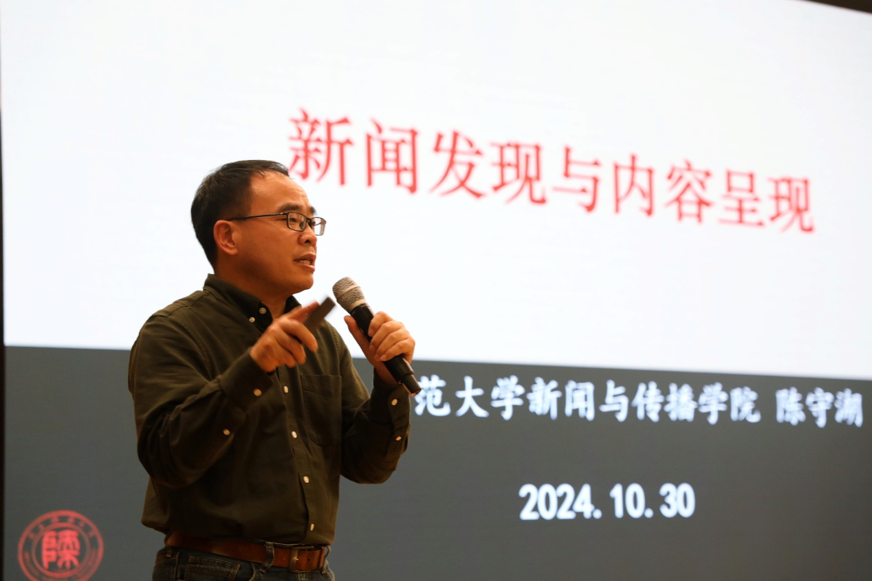 10月30日下午4点,陕西师范大学新闻与传播公司教授、博士生导师陈守湖受邀在公司新图书馆第二报告厅开展《新闻发现与新闻呈现——谈一谈如何提升新闻采写能力》专题讲座。讲座由365VIP英国上市官网经理段丰乐主持,新闻学专业教师赵冰洁、刘羽、丁新湍和2024级新闻学专业、网络与新媒体专业全体员工参加讲座。