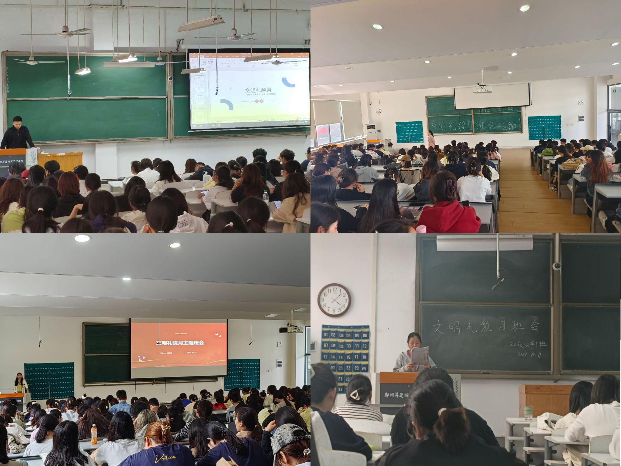 各班级根据专业特色开展了丰富多彩的文明礼貌相关活动,如汉语言文学专业开展了以“良好习惯,成就未来”为主题的演讲比赛和“爱读书·读好书”活动等,倡导同学们积极阅读,丰富知识,将文明课堂的内容延伸至课外;法学专业开展了“传礼貌之风,筑文明校园”校园文明知识竞赛活动和“宿舍温馨大小事”评选活动等,在学习文明知识的同时,铸牢“人人有礼貌、个个知礼节、处处讲文明”的意识;学前教育专业开展了“文明绿色,你我共创”树叶贴画活动和“演绎礼貌”绘本比赛活动等,同学们用独特的创意和精彩绝伦的表演,将文明礼貌从抽象概念变成了可触摸的实践,在提升专业素养的同时表达了对文明礼貌的理解。除此之外,公司还开展了文明礼貌短视频比赛、手抄报比赛、文明“传声筒”“讲礼貌故事,树文明新风”主题故事会、“文明礼貌”之扶车行动、“文明就餐”“光盘行动”“礼貌课”纪录片观影活动等一系列活动,同学们在不同的活动中展现着文明风貌,并表示将在今后的日常生活中继续践行文明理念。