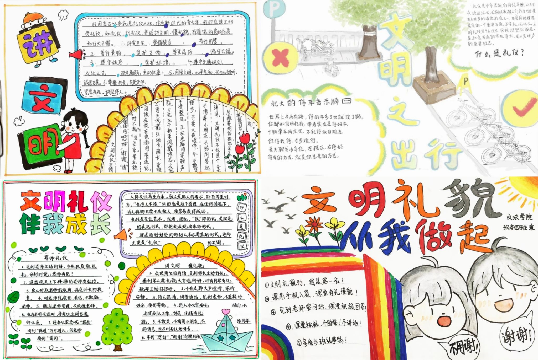 其次,2022级汉语言文学本科专业各班还开展“文明礼貌,从日常点滴做起”为主题的艺术展示活动。在活动中,同学们纷纷运用自己的特长创作出一系列富有创意的作品,有讲解文明的精美手抄报,也有温婉大气的书法作品。通过此次活动,同学们不仅加深了对文明礼貌的理解,更将这一理念内化于心、外化于行。