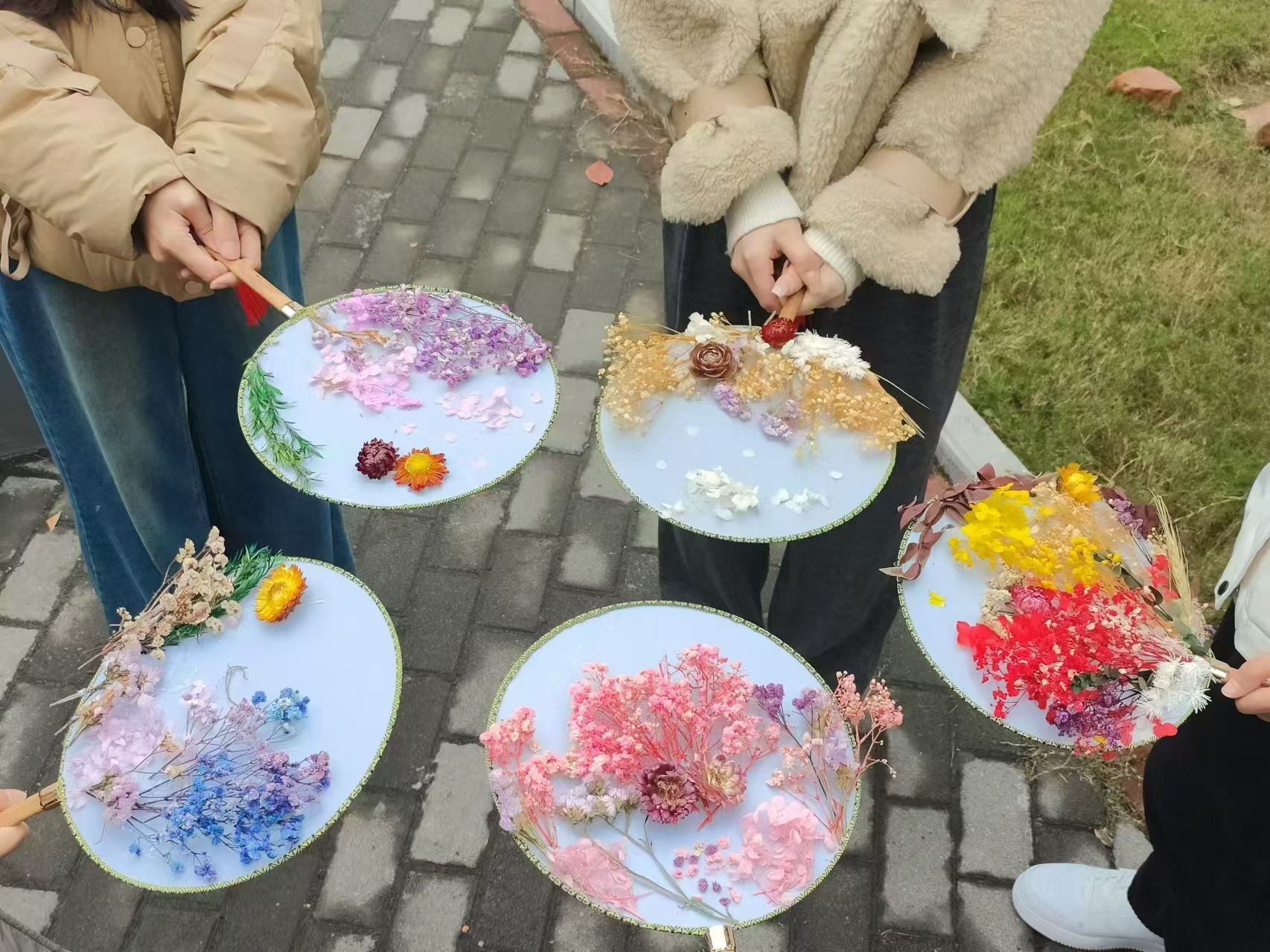 活动现场气氛热烈,同学们利用在校园内收集的各种形状的落叶、枯枝和花瓣等材料,在主办方提供的团扇、书签、贴纸等材料上制作出各式各样的手工艺品:有的同学将干枯的花瓣与树叶粘贴到扇面上制成国风手工干花团扇,有的同学将大片的落叶聚集起来组成落叶花束,还有的同学在图画纸上用彩笔画出娃娃,再把各种各样的叶子按自己的想法拼贴成的娃娃头发,巧手制作出一幅幅生动可爱的粘贴画。除此之外还有落叶书签、落叶篮等多种手工作品形式。现场充满欢声笑语,吸引了许多同学参与其中。在最后的成品展示中,每一件作品都展现了同学们独特的创意,洋溢着秋天的气息。同学们通过手工制作的方式将秋天的美好瞬间定格,留下属于个人专属的秋之记忆,再将这些承载自己巧思的作品送给寄语祝福的人,传达温暖与爱意。