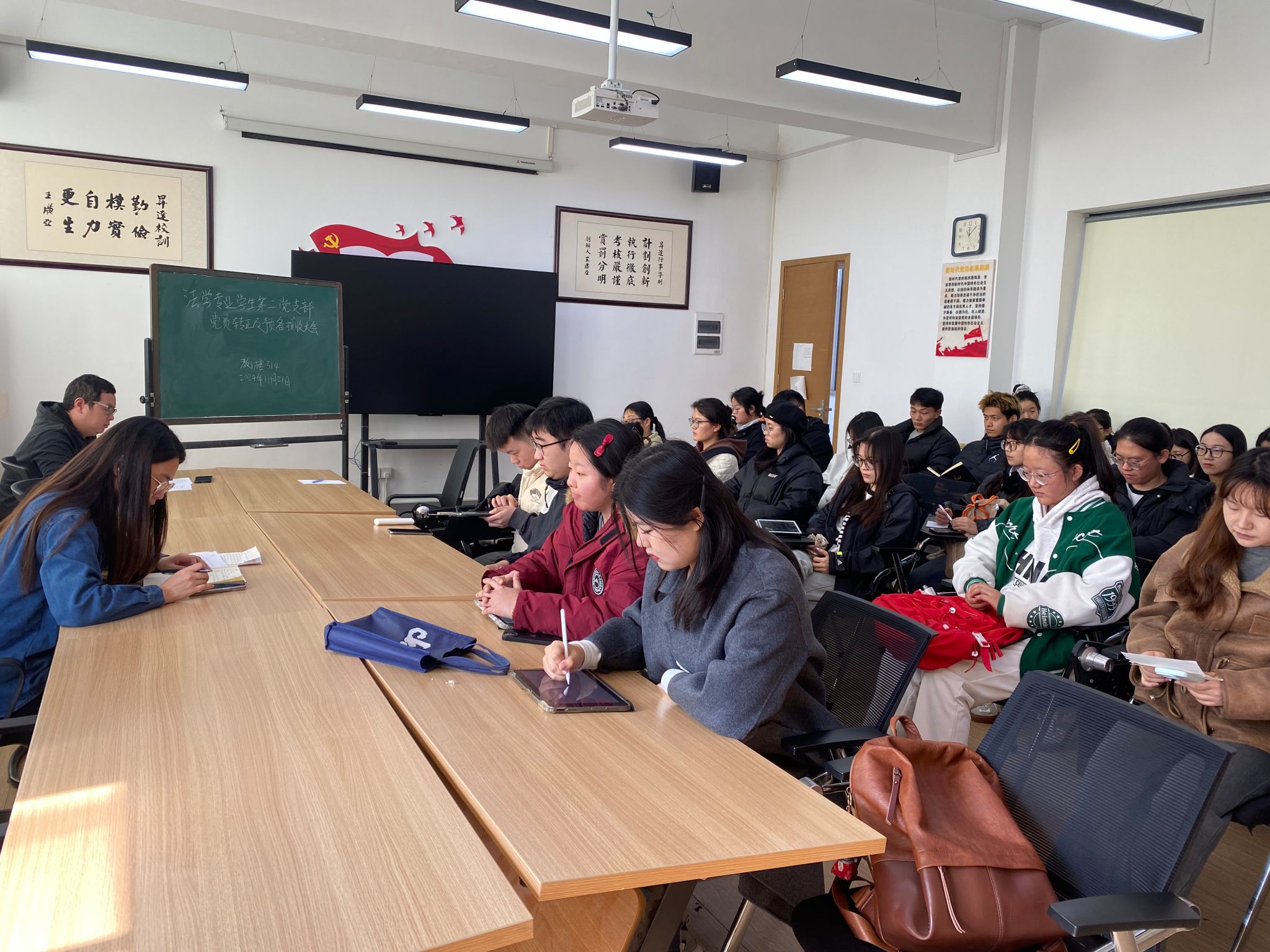 2024年11月22日中午,法学专业员工第二党支部在教学1号楼314教室召开2024年下半年预备党员接收及转正大会。会议由党支部书记李群锋主持,支部全体党员与发展对象共同参与。