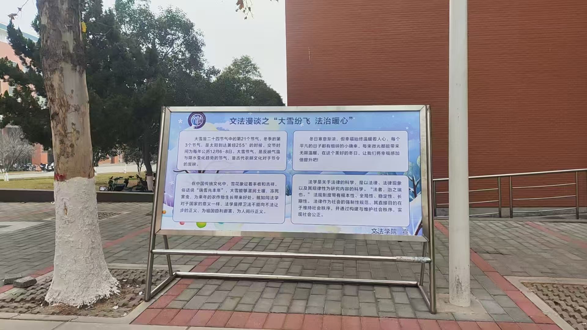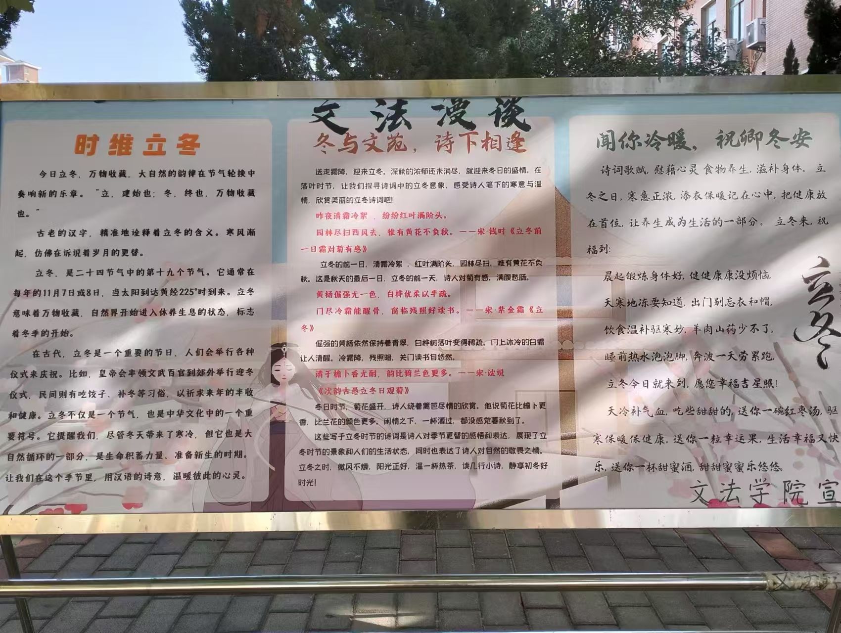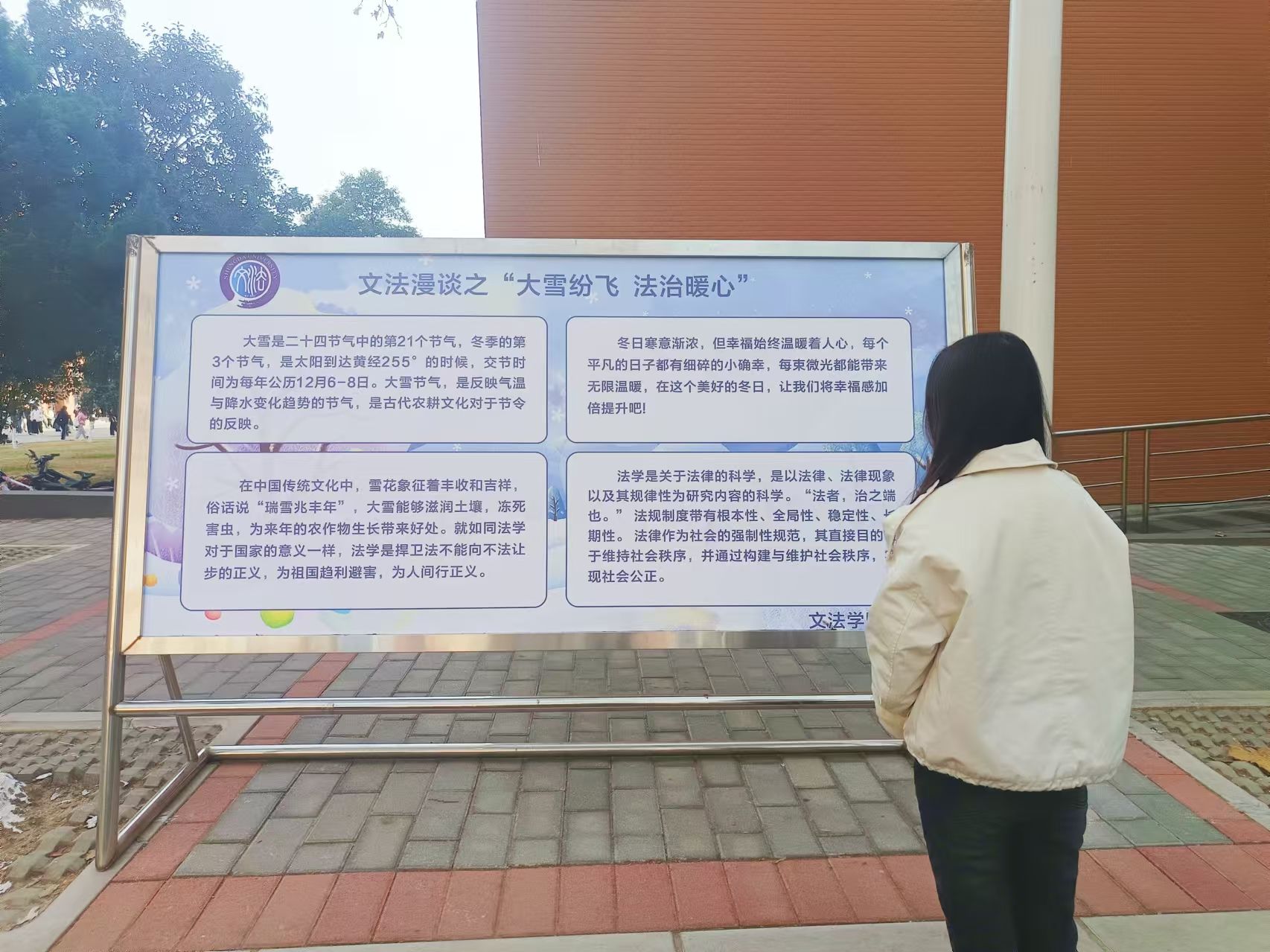 本次活动共分为2期,分别为“立冬与文学”“大雪与法学”,均以展板形式展出。活动以“节气情,文法韵”为主题,通过节气与文学和法律相结合的方式,在传承中华优秀传统文化的同时拓宽了同学们的知识视野。在第1期中,展板内容从立冬与汉字,描写立冬的诗词,对大家的立冬祝福语等方面入手,用文字和语言诠释历史,表达感情,展现了中华优秀传统文化的博大精深。第2期活动中,展板内容巧妙地从“瑞雪兆丰年”与“法者,治之端也”相结合,同时进行法律知识的宣传,以通俗易懂的方式让同学们感受到了学习法律知识的重要性。展板上图画与文字生动形象,吸引了许多同学驻足观看,文化气息洋溢校园,同学们在丰富课余生活的同时也丰厚了自身的学识。