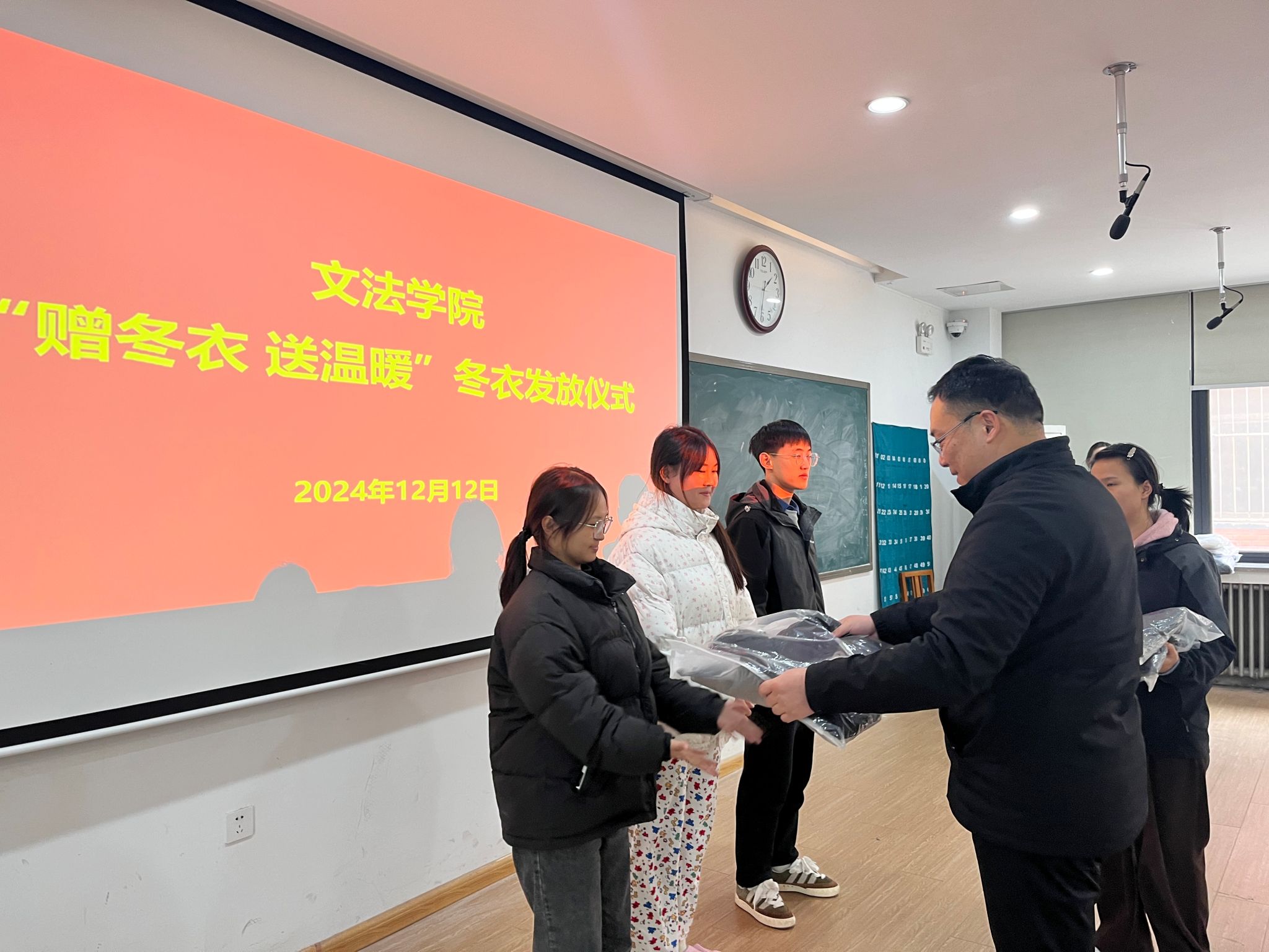在活动上,次活动的意义。向与会同学们表达了亲切的慰问和关怀,并介绍了本次活动意义,这项活动是落实创办人王广亚博士关爱家庭困难员工的具体举措,也是落实创办人王广亚博士“三心”的具体实践。刘晓川书记希望同学们常怀感恩之心,传递温暖,珍惜大学时光,在温暖中奋发前行。随后,刘晓川书记和郑玲玲老师为受助员工代表发放冬衣。受助员工深受感动,表示公司的关爱如同冬日暖阳,给予了他们极大的鼓舞和力量,今后将不断努力,以优异的成绩回馈国家、奉献社会。