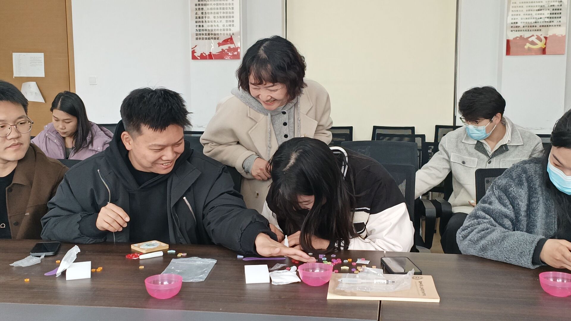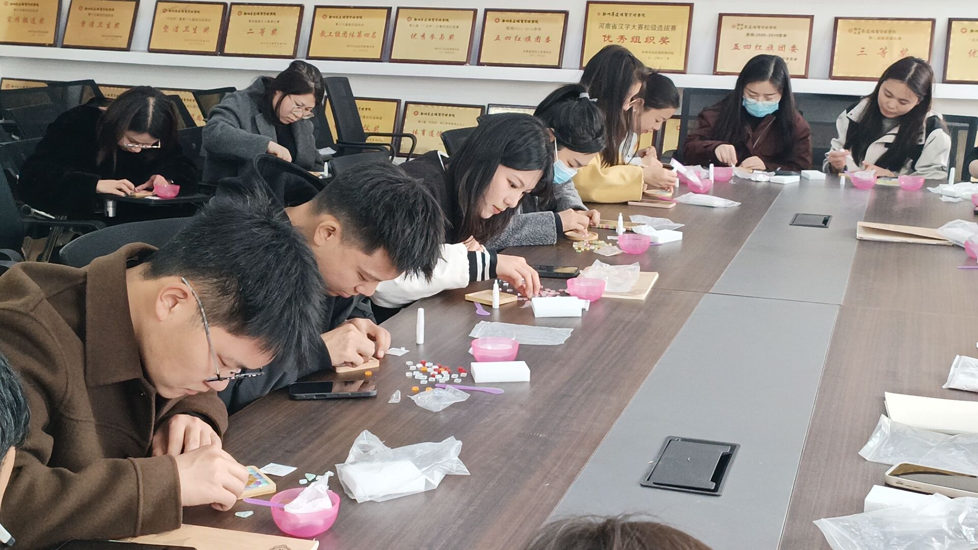 本次活动共分为三个环节。活动开始,郑老师首先为大家普及三八妇女节的相关内涵及价值,赞美女性的辛勤付出。接下来,大家在郑老师的指导下开始设计,师生们融入个人创意,将蕴含着春日气息的彩色瓷片、珠片、贝壳等贴在实木杯垫上。制作完成后,大家欣赏着彼此的创意杯垫,现场一片欢声笑语。
