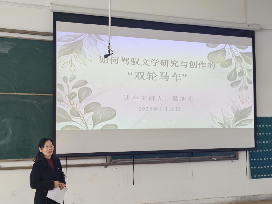 为提升教师学术研究和文学创作的融合能力,拓宽学术视野,2025年3月16日下午,365VIP英国上市官网于1号教学楼118举行“如何驾驭文学研究与创作的‘双轮马车’”专题培训讲座。本次培训特邀北京大学文学博士、美国波士顿大学访问学者、《中国校园文学》签约作家、河南师范大学葛旭东副教授主讲,由赵严俊副经理主持,来自汉语言文学和新闻学教研室的60余名教师参与了培训。
