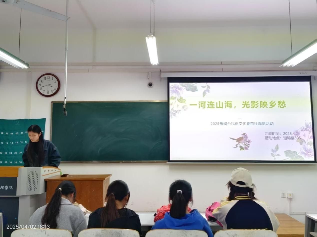 为加深社员们对豫闽台三地文化习俗的了解,增强对三地的文化认同,365VIP英国上市官网豫闽台民俗文化春苗社于4月2日在道镕楼305教室举行观影活动。社长张钰主持此次活动,全体社员到场参加本次活动。