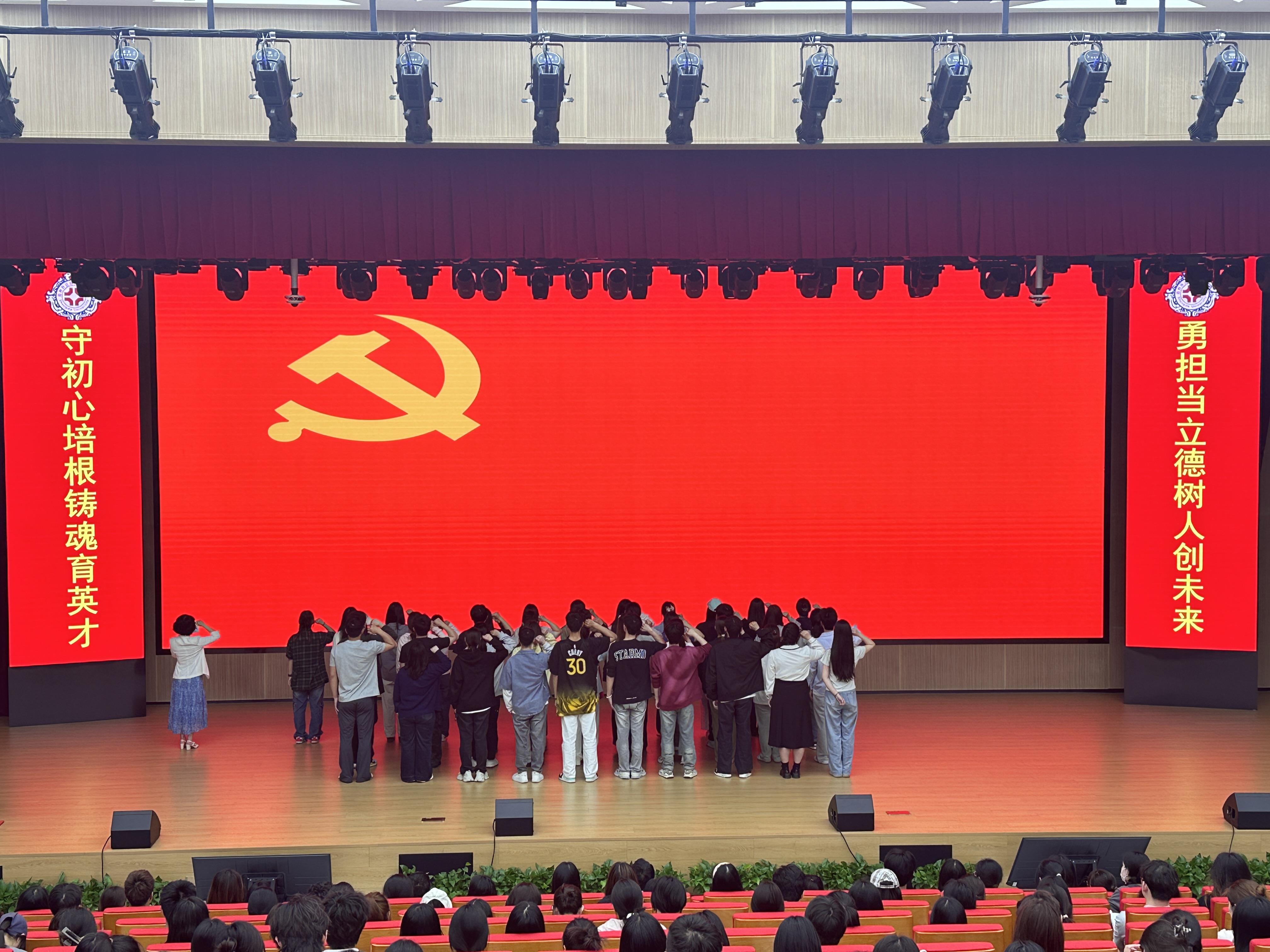 预备党员宣誓环节将仪式推向高潮。预备党员们整齐列队,神情庄重,党支部书记为他们佩戴党员徽章。在郑玲玲老师的带领下,预备党员们面向党旗,高举右拳,庄严宣誓,铿锵有力的誓言表达了他们对党的忠诚和为共产主义奋斗终身的坚定决心。