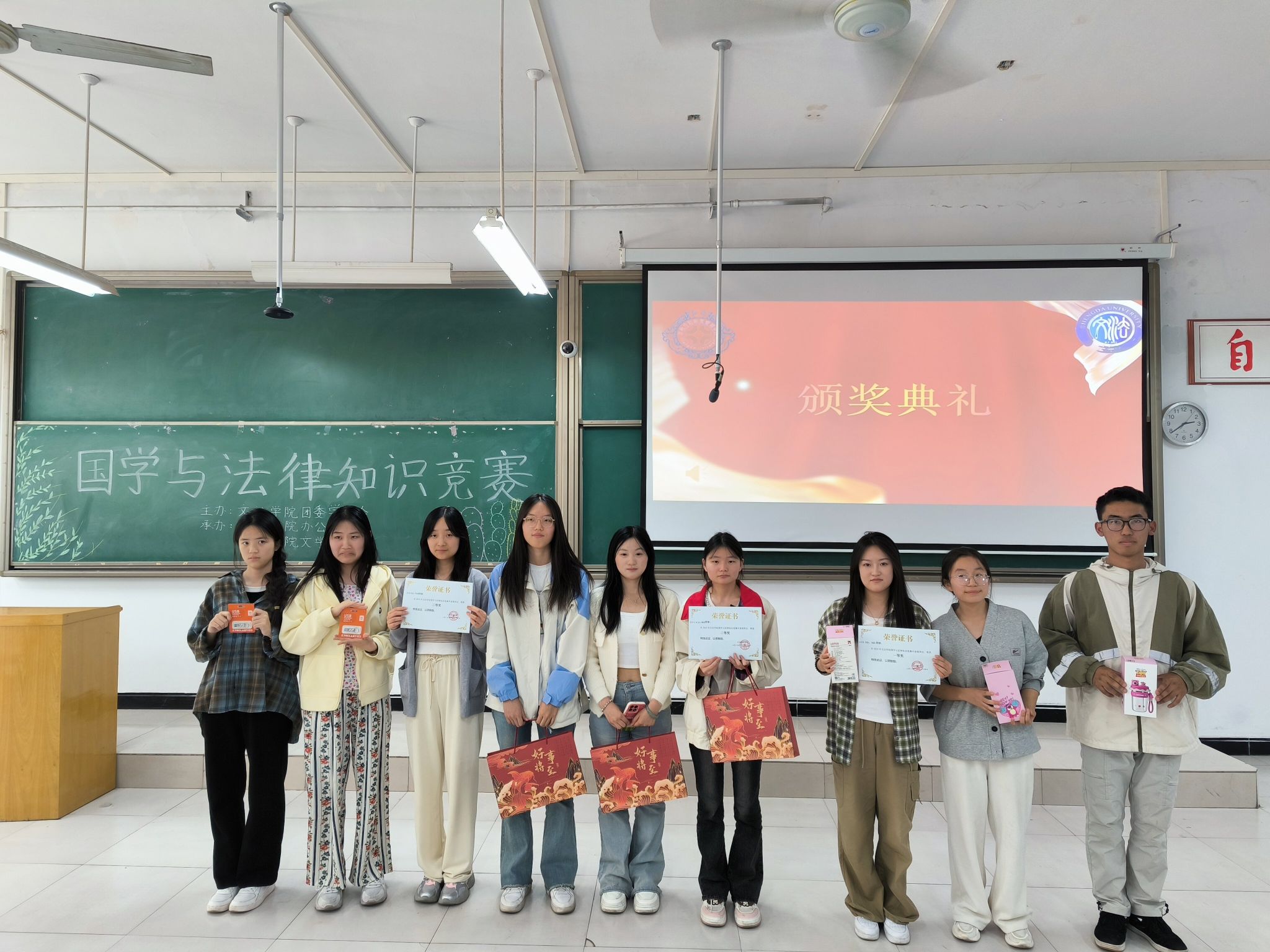 在主持人热情洋溢的介绍下,本次竞赛拉开序幕。竞赛分为三个环节:“大浪淘沙”、“飞花传令”和“谁与争锋”。在“大浪淘沙”环节,参赛队伍通过答题比拼展现了扎实的知识储备;随后的“飞花传令”环节,选手们围绕“花、月、夜”等主题词展开诗词接龙,你来我往,妙语连珠,一句句经典诗词从他们口中流淌而出,有的气势磅礴,有的婉约动人。“春江潮水连海平,海上明月共潮生”“月上柳梢头,人约黄昏后”等精彩的诗词接龙引得台下观众连连叫好,掌声此起彼伏,仿佛置身于诗词的浪漫海洋;最后的“谁与争锋”环节,选手们或引经据典,从诸子百家的思想智慧谈到现代法治精神的传承;或结合实际案例,深入剖析法律条文的内涵与意义,赢得了阵阵掌声。评委根据表现进行评分,最终24级法学本科3班的牛书贤、郑得志、李婧晨获得一等奖,24级汉语言文学本科2班的吕欣洁、张佳怡、马萌萌获得二等奖,24级网络与新媒体2班的郭乐彤、郭美佳、裴豫粤获得三等奖,主办方为获奖队伍颁发了奖状和奖品。活动最后,韩君君进行总结发言,认为此次国学与法律知识竞赛的成功不仅在于主办方的策划,更在于参赛选手们的悉心准备与大力支持,她表示此次竞赛可以唤醒文化自信,强化法律意识,实现传统文化与现代法治理念的融会贯通,竞赛在热烈的氛围中圆满落幕。