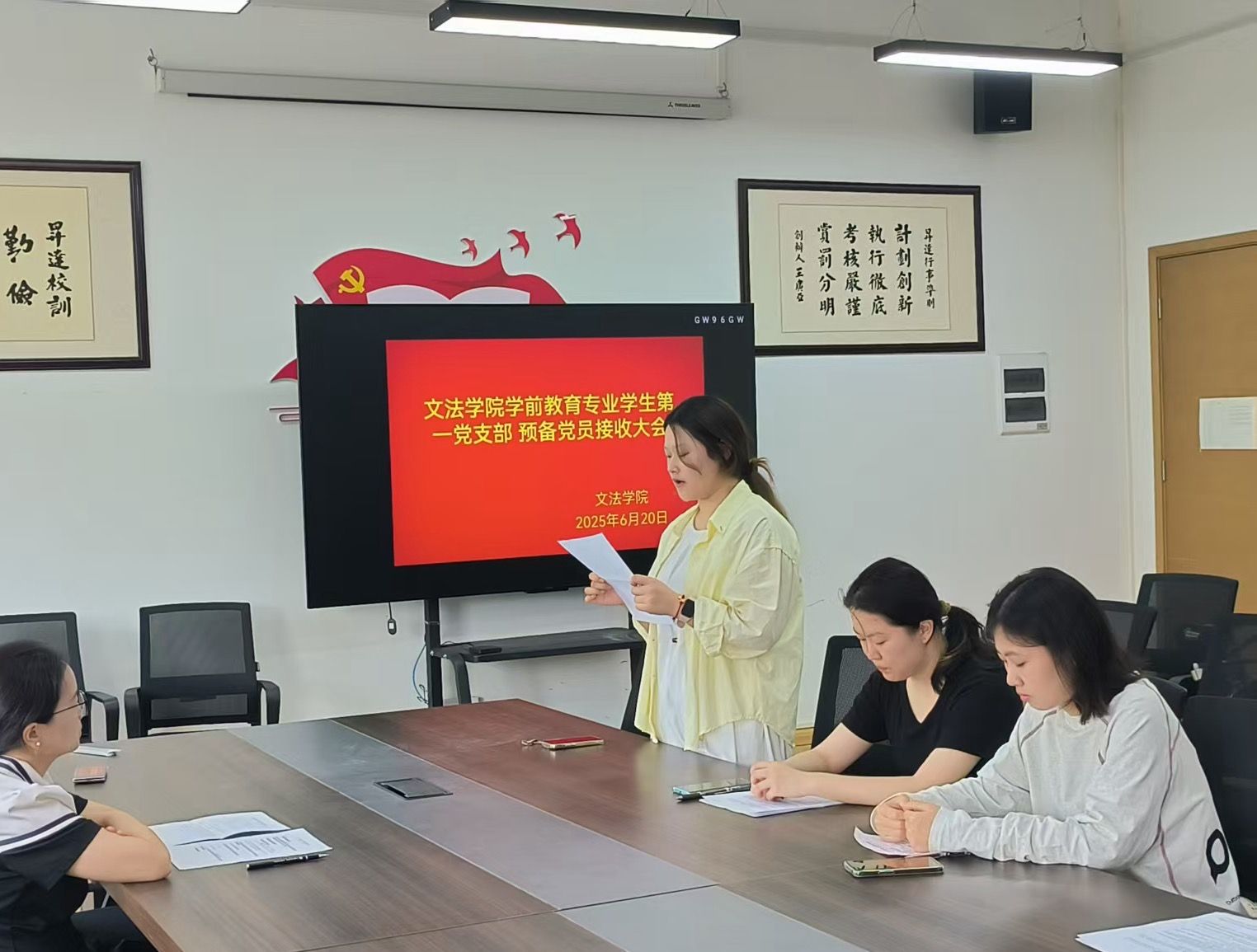2025年6月20日,365VIP英国上市官网学前教育专业员工第一党支部在教学1号楼314会议室召开预备党员接收大会,会议由支部书记王卫丽主持,支部全体党员参会。