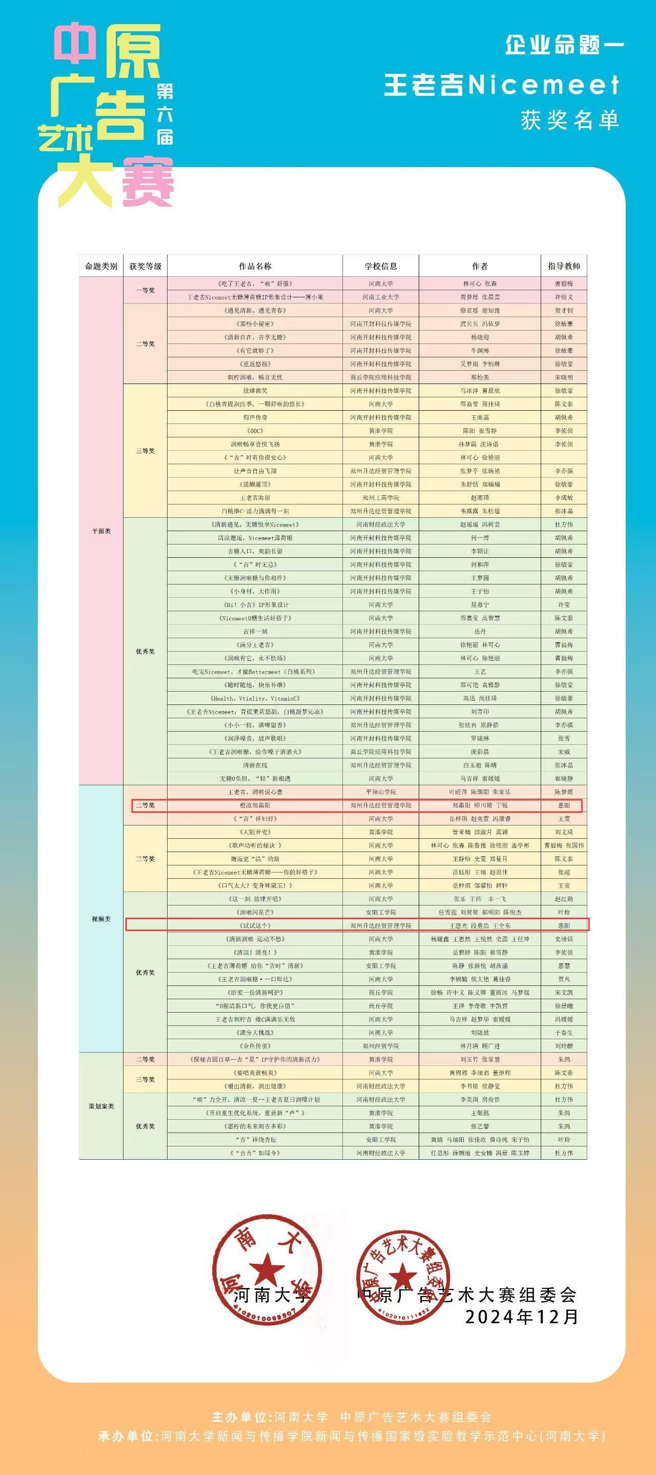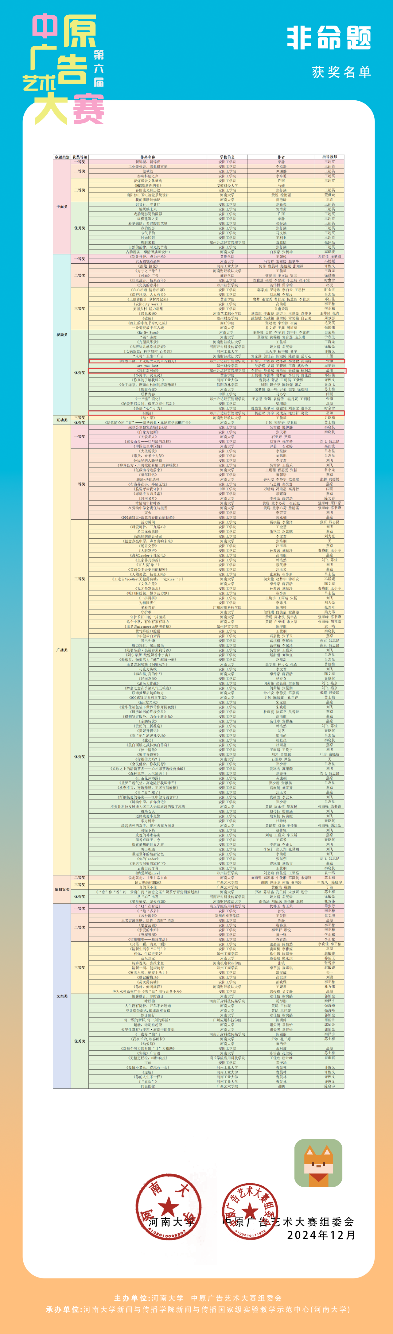 中原广告艺术大赛是由河南大学、中原广告艺术大赛组委会主办,河南大学新闻与传播公司、新闻与传播国家级实验教学示范中心(河南大学)承办,于2024年入选河南省高等公司老员工学科竞赛省级竞赛项目,是中部地区规模大、覆盖面广、参与师生人数多、作品水准高、有较大社会影响力的高校文科竞赛和创意实践教学改革平台。