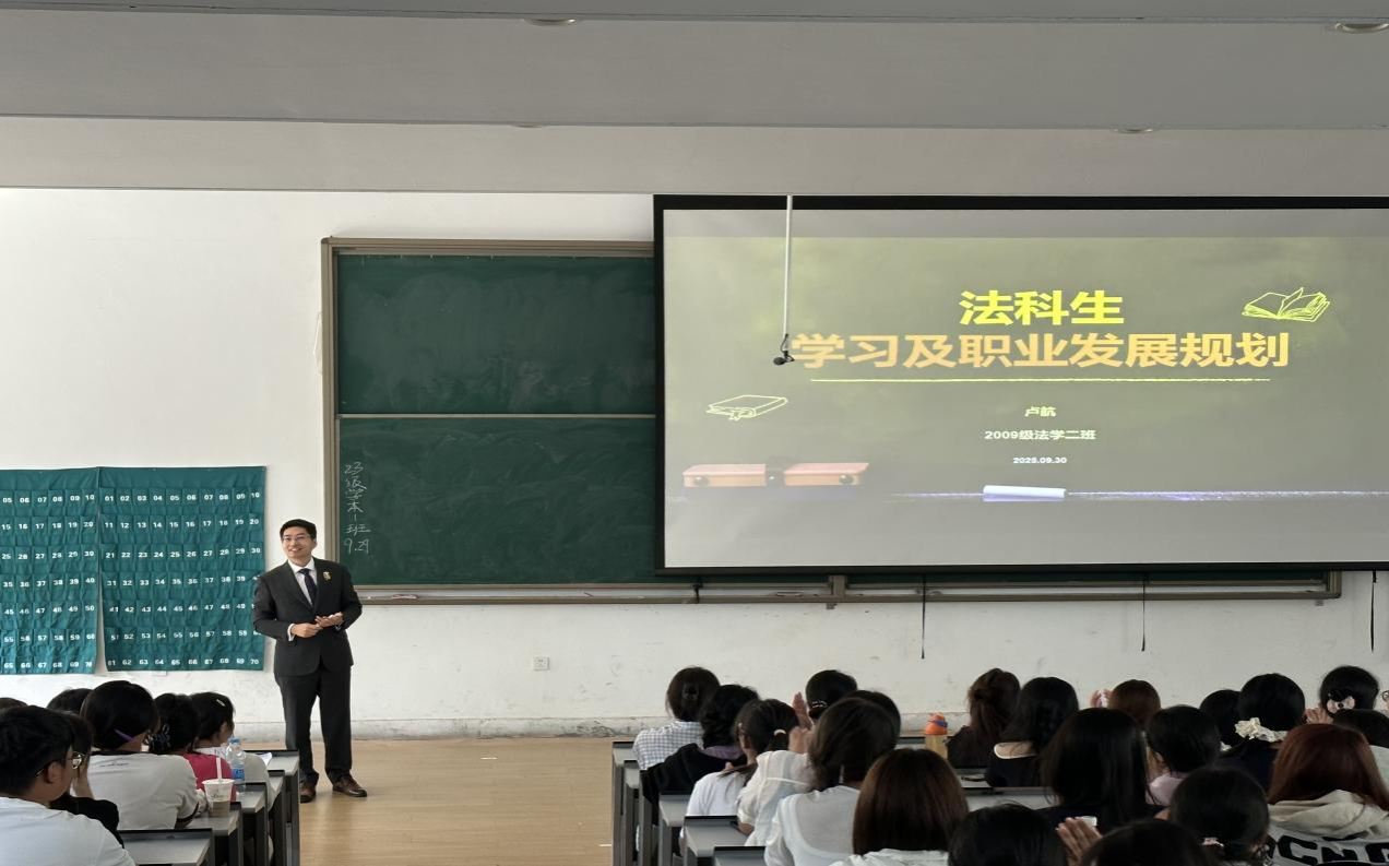 9月30日上午,公司在教学1号楼118教室举办“法科生的学习与职业发展规划”专题讲座。本次活动邀请了公司优秀员工2009级毕业生卢航律师,与2025级法科生们进行了一场坦诚而深入的交流。