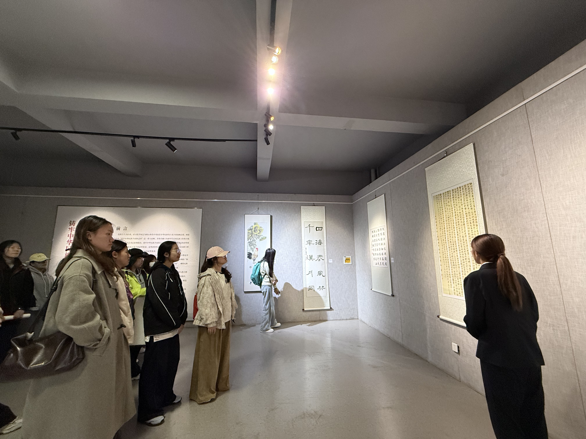 展厅内,百余件作品以笔墨寄情、以书画叙事,生动展现了各民族交往交流交融的动人场景与独特文化魅力。在讲解员的细致引导下,师生们驻足凝视、轻声交流,从遒劲的笔墨、生动的画面中,重温中华民族休戚与共、荣辱与共、生死与共、命运与共的历史脉络,深刻领会“铸牢中华民族共同体意识”的核心要义与实践要求。