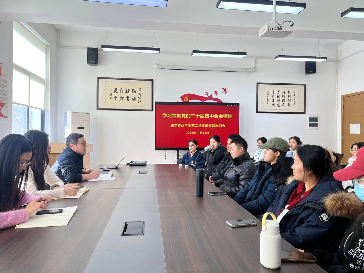 为深入学习贯彻党的二十届四中全会精神,切实把党员思想和行动统一到党中央决策部署上来,11月18日,法学专业员工第二党支部在教1楼314召开专题学习会议。会议严格落实 “第一议题” 制度,由党支部书记李群锋主持并领学,支部全体党员参加学习。