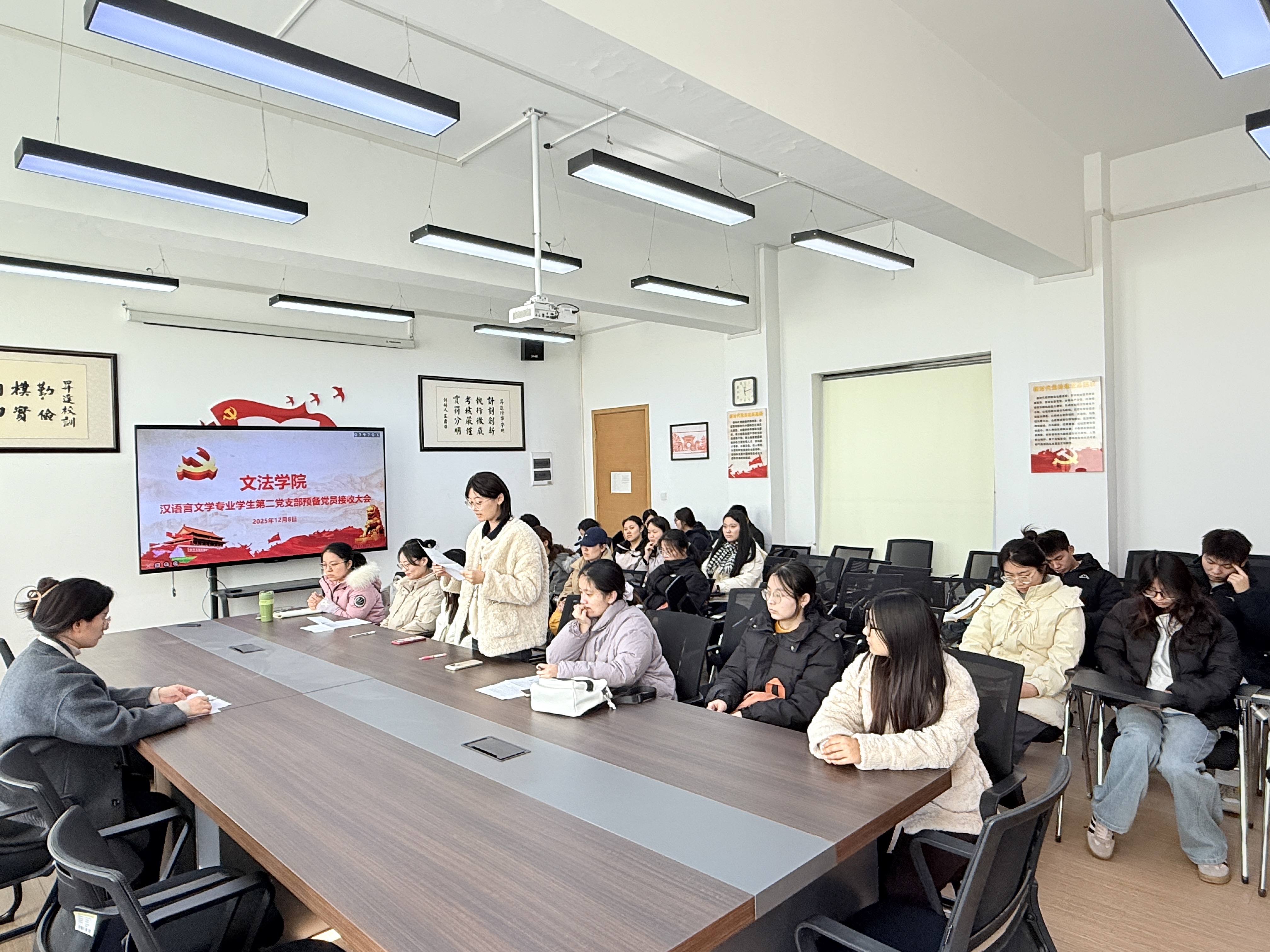 12月8日中午,汉语言文学专业员工第二党支部在教学1号楼314会议室召开预备党员接收大会,全体党员参加,书记张丽凯主持会议。