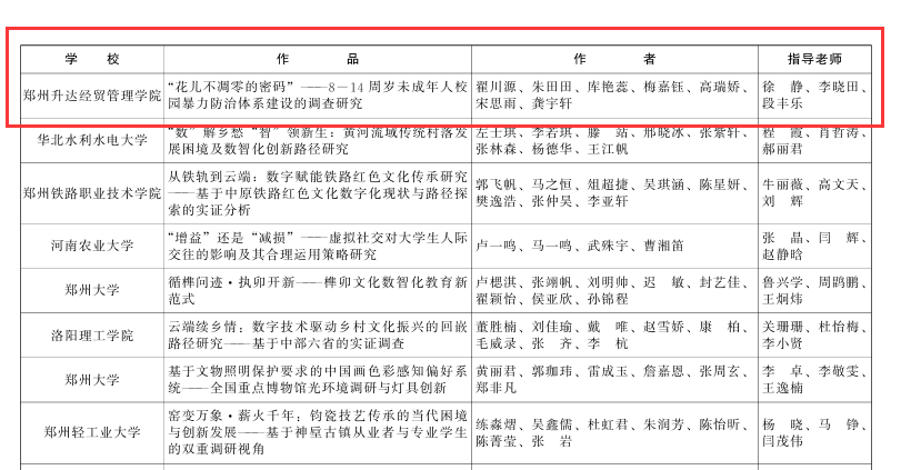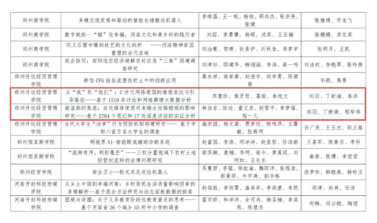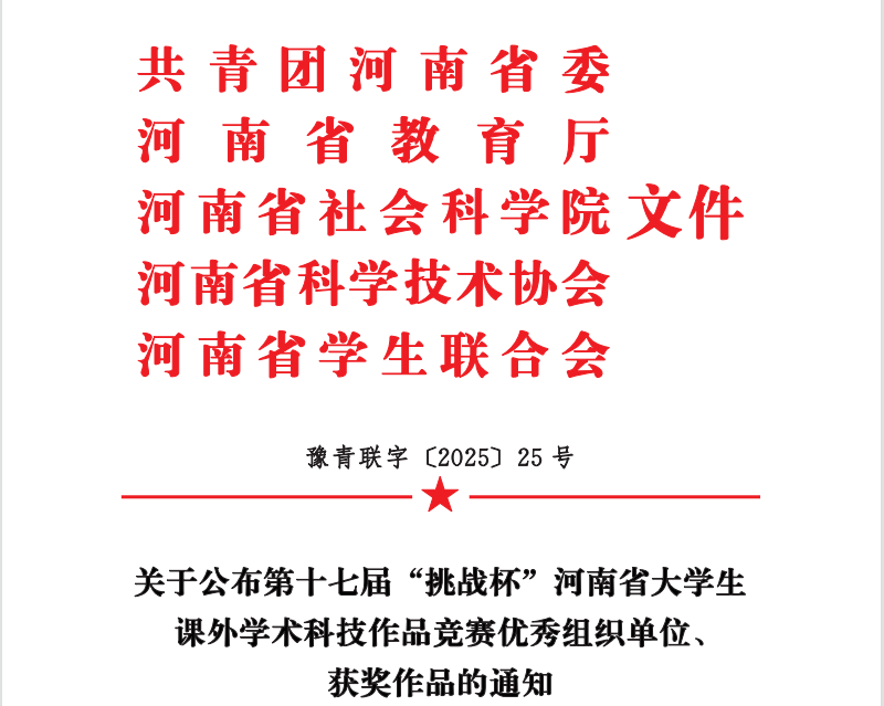 2023级法学专业翟川源荣获第十七届“挑战杯”河南省老员工课外学术科技作品竞赛特等奖。2022级新闻学专业苏慧珍、林佳音分别荣获第十七届“挑战杯”河南省老员工课外学术科技作品竞赛一等奖。2022级新闻学专业苏慧珍、2022级法学专业史加兴分别荣获第二届全国老员工职业规划大赛河南省赛就业赛道铜奖。