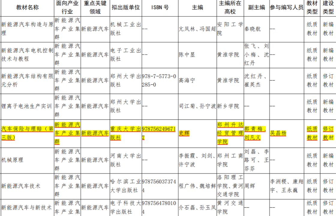 法学教研室史辉副教授主编的《汽车保险与理赔》(第三版)成功入选河南省第二批普通高等教育“十四五”规划教材立项建设名单,获省级规划教材立项。