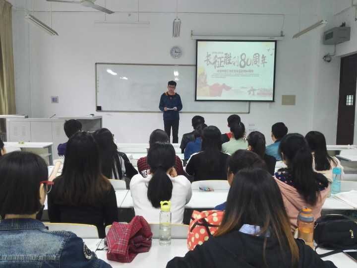 在支部精心策划和各党员的带领下,各班的活动精彩纷呈。13级新闻班的同学们以观看PPT的形式,回忆长征路上的光辉印迹——四渡赤水、强渡乌江、爬雪山、过草地……向我们重现了热血挥洒的长征岁月;13法班的同学们通过长征历史知识介绍,使同学们在庄重的氛围中学习长征精神,感受革命激情;13汉语言文学班的同学们则开展了声情并茂的诗歌朗诵主题班会,铿锵有力的朗诵声,重现了二万五千里长征的艰难历程,歌颂了中国工农红军不畏艰险,不惧艰难的革命乐观主义和勇于战斗,无坚不摧的革命英雄主义。