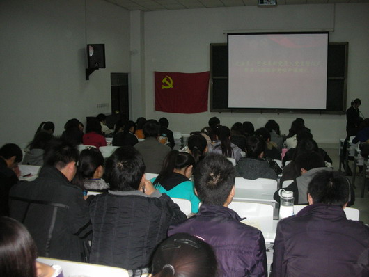 晚上6:30,典礼正式开始。首先,全体与会人员起立,场内响起嘹亮的《国际歌》。接着文法学系党支副书记杨明志发表讲话,首先他对在场的新党员和本期业余党校成员表示祝贺,祝贺大家积极追求进步,投入党组织的怀抱;其次,他介绍了本期党校的课程安排情况,希望大家能认真学习党课,积极参加相关组织活动;最后,他勉励新党员和业余党校新成员在以后的学习、工作过程中接受组织考验,从学业和纪律上严格要求自己,成为一名合格的共产党员和争取早日加入中国共产党。