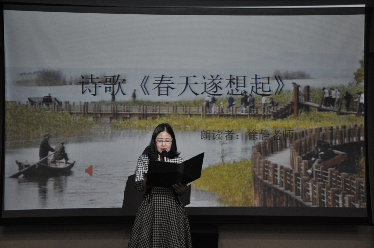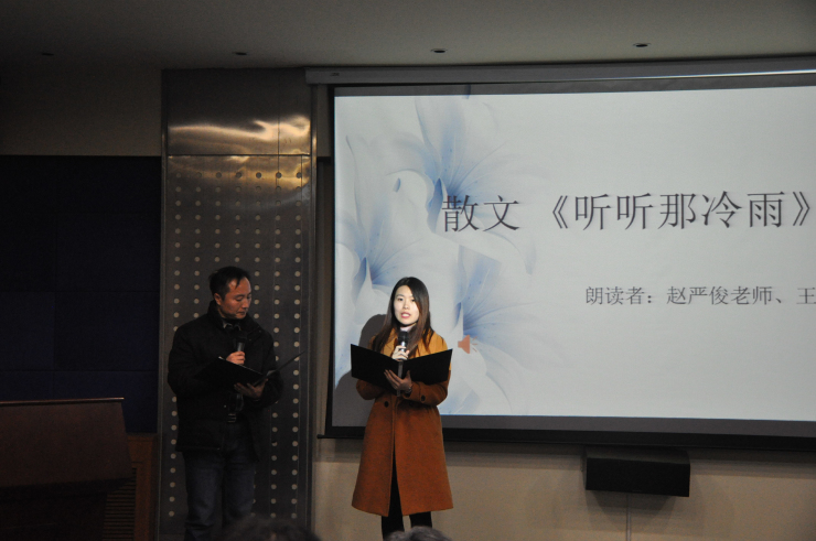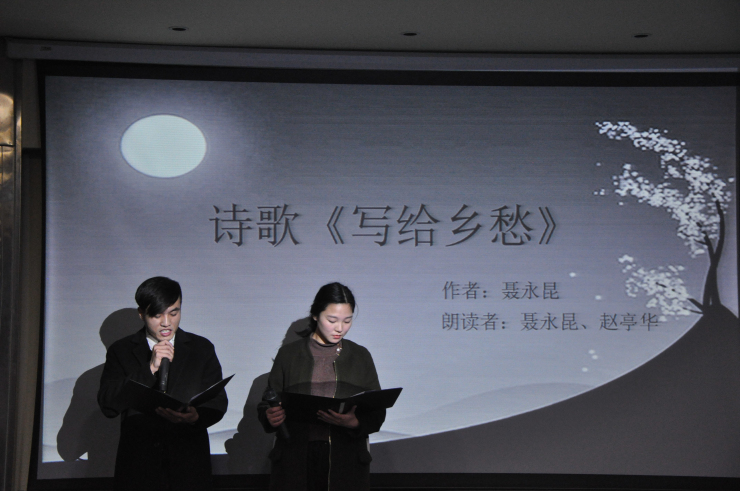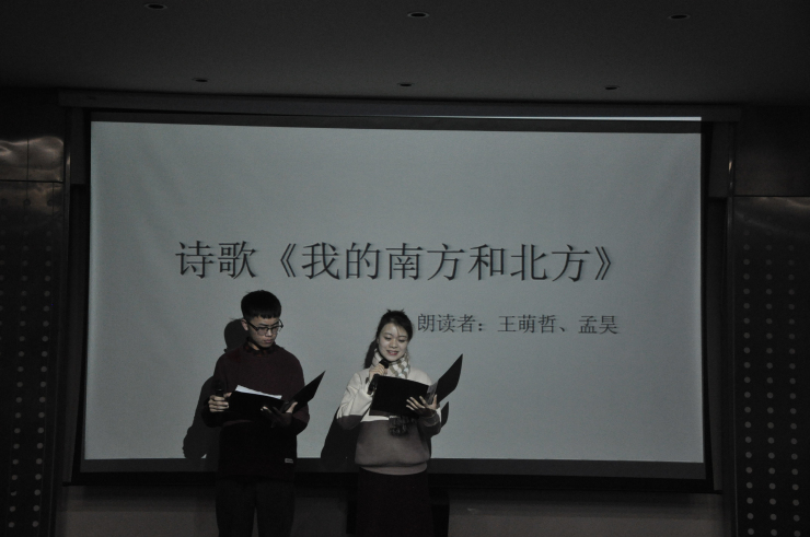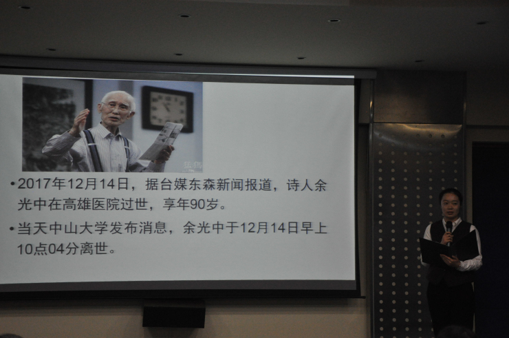 诗会伊始,由赵严俊老师为同学们简单介绍了余光中先生的生平。随后赵老师和王慧慧朗读了余光中先生的散文《听听那冷雨》,带领大家走近先生的世界。接着,刘晨阳和陈冉朗读的诗歌《等你 在雨中》,通过“莲”这一中心意象,展现了余光中独特的中国意识。紧接着徐静老师带来的《春天,遂想起》及王帅杰和王晶朗读的《永远 我等》,再现了余光中先生对故乡、祖国的留恋和对爱情的忠贞不渝。最后,刘羽老师向我们细细讲述余老的生平事迹及余老那近乎完美的爱情,让同学们对余老有了更深入的了解…… 最后,文学中心副部长王鼎乾献唱《最长的旅途》,让大家在歌声中重温余光中先生作品。本次读诗会在师生对余老的深深缅怀中圆满落幕。