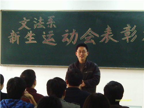 11月17日下午1:20,文法学系新生运动会表彰暨冬训动员大会在商管楼121教室举行。文法学系段丰乐主任、系团委书记兼行政秘书郑玲玲老师、团委副书记郝艳海老师及08级团总支书记彭凯老师出席了本次大会。团学会主要干部及2010级各班班委参加了本次表彰大会。