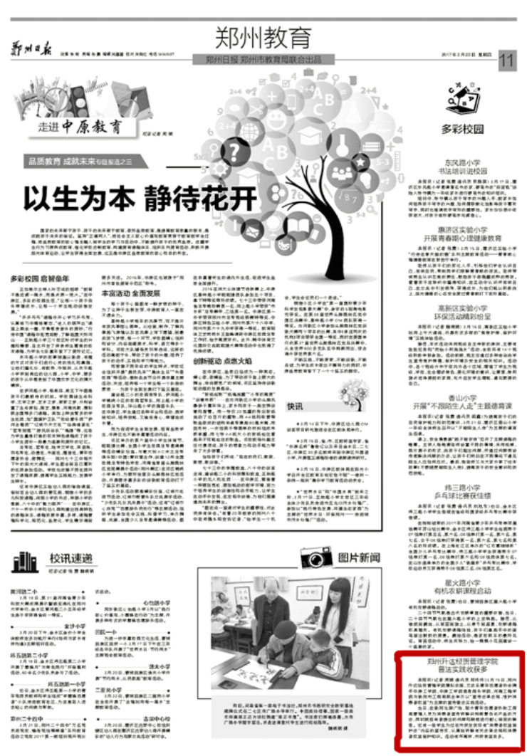 3月23日,《郑州日报》第11版郑州教育版刊文《365VIP英国上市官网普法实践收获多》报道公司3.15普法实践活动。