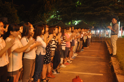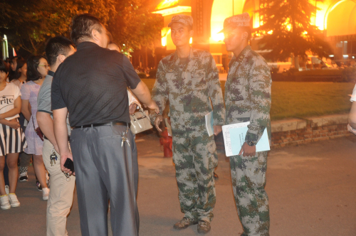 9月1日晚7:30,文法系2015级全体新生在体育馆门前集合,系主任段丰乐、系党总支杨明志书记、系行政秘书兼团委书记郑玲玲老师以及2015级新生辅导员张明奇老师一同来到新生军训场地慰问军训教官和15级新生。