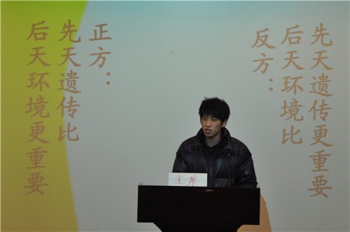 本场决赛共分为五个环节,经过循环赛的磨练,辩手们更加沉着冷静。在开篇立论环节中,双方辩手落落大方,思维缜密,正方一辩根据科学理论,提出了先天遗传比后天环境更重要的立论,反方一辩则立足现实,举例证明了后天环境比先天遗传更重的立论;在攻辩环节中,双方辩手妙语连珠,唇枪舌剑,你来我往,将比赛推向了一个新阶段;而在其中的攻辩小结中,双方更是从容淡定,激情昂扬,比赛也愈演愈烈,精彩纷呈;在之后的自由辩环节中,双方辩手可谓是针锋相对,互不相让,他们精彩的语言赢得了观众的阵阵掌声,也将比赛推向了高潮;在结辩陈词环节中,双方四辩旁征博引,从各方面论述了自己的观点,同时,攻诘对方言论中的漏洞,他们语言流畅,思路清晰。最后,在与观众互动环节中,面对观众的积极提问,双方辩手的回答有理有据,赢得了热烈的掌声。