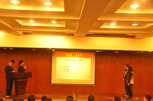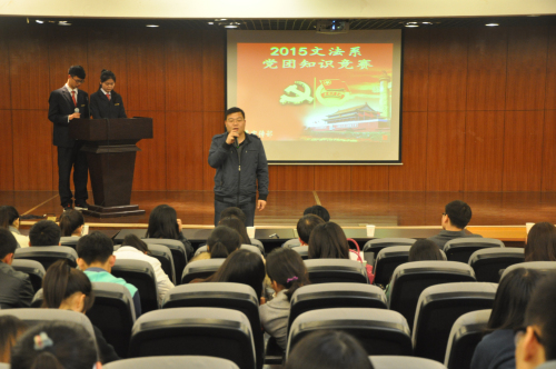 为了更好地组织好党团建设,加深老员工党史文化的理解,丰富同学们的精神文化生活,3月18日晚18:30,我系团委宣传部在外语楼多功能报告厅2楼举办了“党团知识竞赛”活动。出席此次活动的嘉宾有文法系12级团总支书记彭凯老师、14级团总支书记刘建辉老师、11级团总支书记吴艳豪老师,团委副书记刘冰岩、员育蒙、团委书记助理袁晓雨、员工会主席张宗华、员工会副主席朱劝劝、刘旭如也到场观看了此次比赛并担任评委。