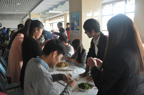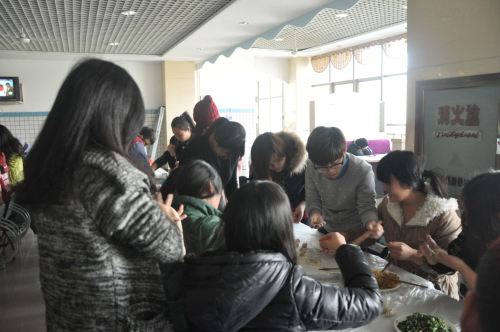 中午12点,同学们以各部门为单位开始忙活起来。生活部将提前准备好的面皮、饺子馅及工具分发给各部之后,包饺子大赛正式拉开序幕,同学们迅速行动起来!大家分工合作,互相帮助,切面、擀饺子皮、包饺子……大家忙的不亦乐乎。包饺子简单,可是擀饺子皮却难住了好多同学,不过还是有几位“巧手”,擀皮又快又圆,值得一提的是这几位擀皮巧手中不乏男生。同学们热热闹闹包着饺子,现场洋溢着浓浓的节日氛围。饺子包好后即刻送到食堂工作人员那里,在等待期间同学们互相交流,谈论一些学习及生活方面的问题,餐厅里面不时传来阵阵笑声。饺子煮熟后大家围在一起,品尝着一起包的饺子,脸上洋溢着甜蜜的笑容。最后同学们一起合影留念,迎冬至包饺子活动在一片欢声笑语中圆满结束。
