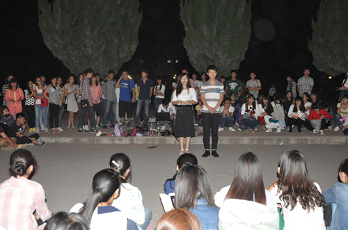 9月22日晚7:30,由文法系团委员工会举办的“慰问新生下方阵”文艺表演在图书馆前拉开帷幕。此活动由系主席团, 团学会成员以及我系14级新生共同参与。团学干部们为新生和教官们带来了精心准备的各种形式的节目:美丽动听的歌曲、激情四射的舞蹈、扣人心弦的魔术表演等。