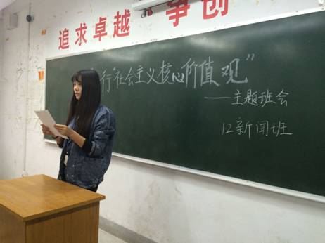 为弘扬社会主义核心价值观,让同学们对社会主义核心价值观有更好的认识和了解,2014年11月6日下午两点,文法系12级新闻班在综合楼212召开了“践行社会主义核心价值观”的主题班会。会议由团支书安奥杰主持,支部31名同学参加了此次会议。