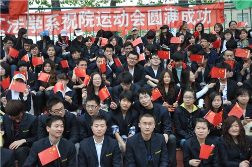 看台上,“文法学系祝院运动会圆满成功”的条幅分别醒目。文法学系观众身着统一服装,每人手拿一面小红旗,在系团学干部响亮而有节奏的鼓点的指挥下,全体观众挥舞着小红旗情绪高昂地为包括文法学系运动员在内的全院运动员们呐喊助威,展现了文法学子良好的精神风貌,真正践行了“友谊第一,比赛第二”的运动精神。
