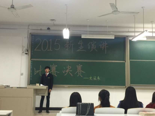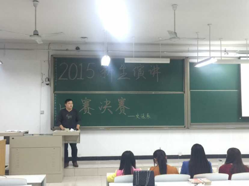 为纪念抗战胜利七十周年,丰富校园生活,文法系于10月19日晚7点在时金楼207教室举行了2015级新生演讲比赛。出席本次大赛的嘉宾有:团委常务副书记彭凯老师,15级新生辅导员张明奇老师。评委有:员工会团委副书记王玮辉、张园园,员工会主席张文,员工会副主席陈莹、李俊儒、董小双等。文法系15级全体新生到场观看比赛。
