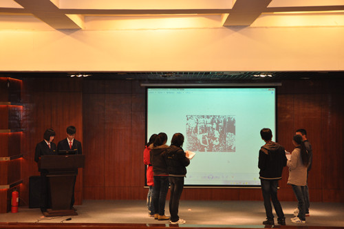 随后,比赛正式开始。第一环节是知识竞赛,在此环节中,参赛选手集体上场,以亮牌形式进行淘汰赛,选手们沉着冷静的应对比赛。接下来第二环节的复活赛,为第一轮淘汰的选手提供了又一个机会,选手们全力以赴,现场气氛活跃。第三环节的革命歌曲接力中,《红星闪闪》、《映山红》、《龙的传人》、《南泥湾》等一首首经典革命歌曲,不仅考验了同学们对革命歌曲的记忆能力,而且唤起了大家的革命情怀,引起了大家情感的共鸣,将比赛推向高潮。最后的图片识别环节,共有5幅图片,涉及日本侵华战争、东京审判等历史事件,同学们写出了其发生的时间、涉及人物等,加深了对历史的认知。此外,一个轻松有趣的游戏“踩报纸”缓解了比赛的紧张气氛,也让现场更多的同学参与到活动中来。