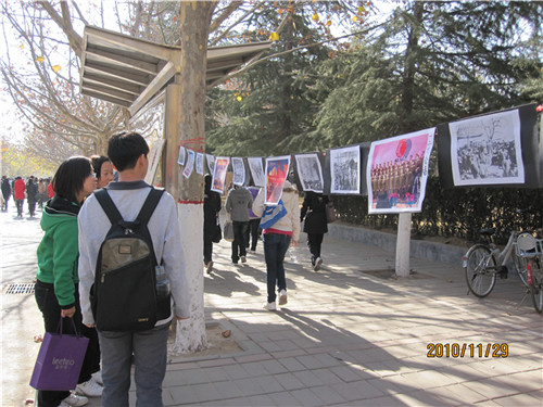 本次图片展共分三部分:铭记历史、立足现在和展望未来。铭记历史部分基于历史事实,尊重历史原貌,展出了许多关于“一二九”的珍贵老照片以及历年来全国各地以特殊方式纪念“一二九”运动的精选照片。立足现在和展望未来部分,立足时事热点和舆论焦点,展出了很多关于中日邦交和钓鱼岛事件的时事照片。为方便同学们观看了解,展出照片旁多附有简单明了的文字说明。从旁经过的同学们不顾瑟瑟寒风,纷纷驻足于展出的照片前,抚今追昔,唏嘘不已。七十五载已逝,先烈们的英雄事迹依旧广为传诵,他们伟大的爱国精神,一直在被发扬光大,时殊势异,不变的则是莘莘学子的拳拳爱国之情。